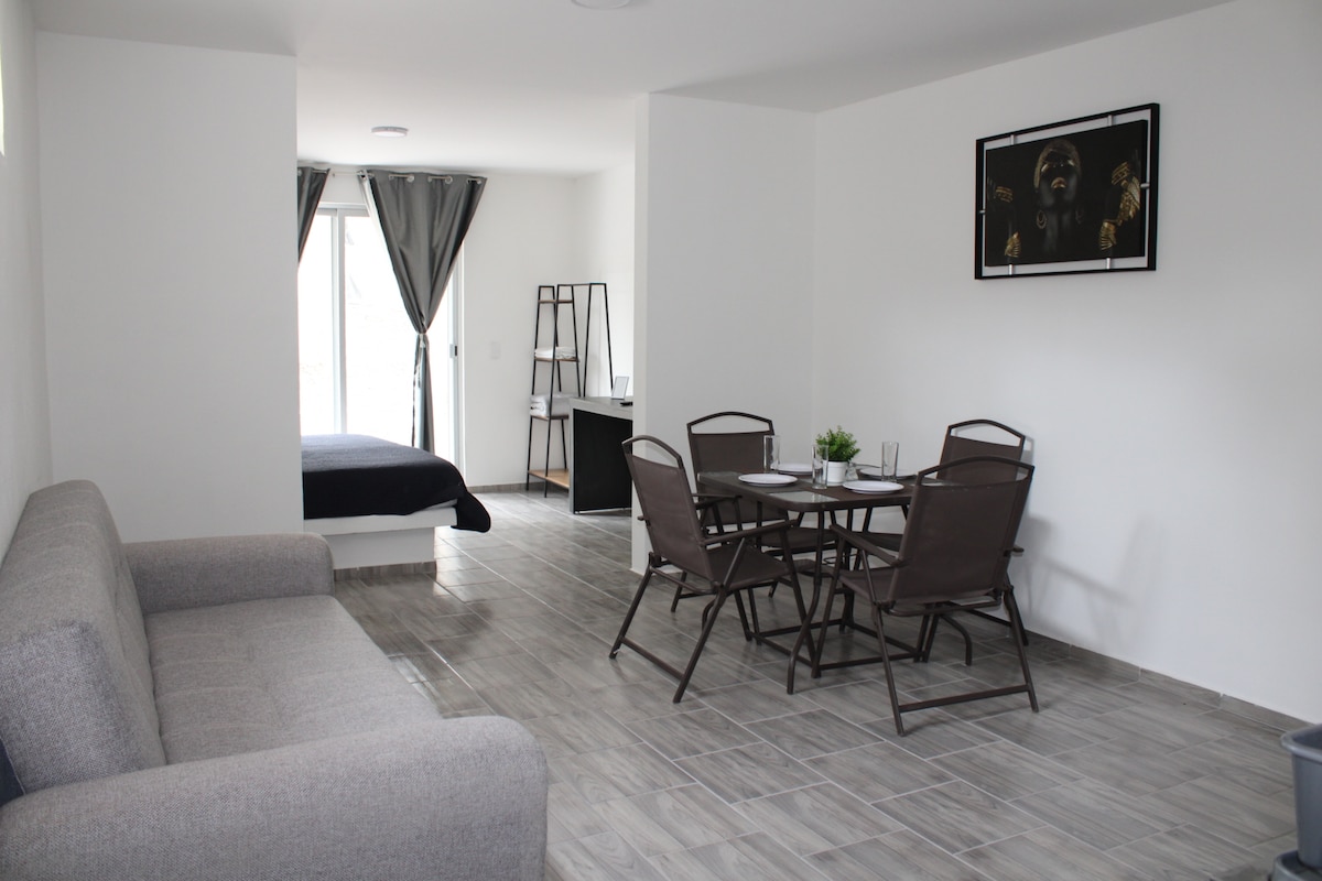 Bungalow pour 4 personnes situé dans le beau jardin de cactus d'une maison résidentielle dans un fractionnement privé et sécurisé à 15 minutes du village de Tequisquiapan. Jolie terrasse avec rôtissoire, grand jardin avec hamacs et vue sur les serres et jardin divin. Parking à l'extérieur de la maison, petit déjeuner supplémentaire en option, lave linge et sèche linge également extra en option.