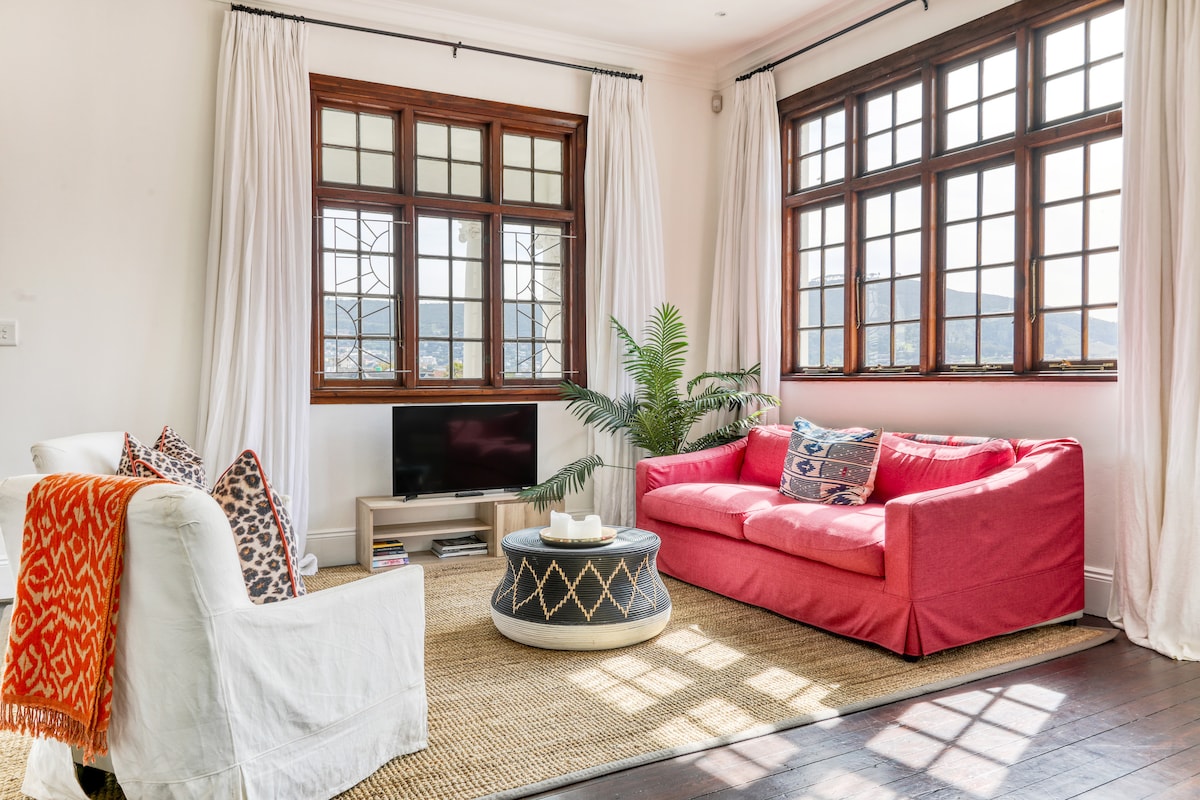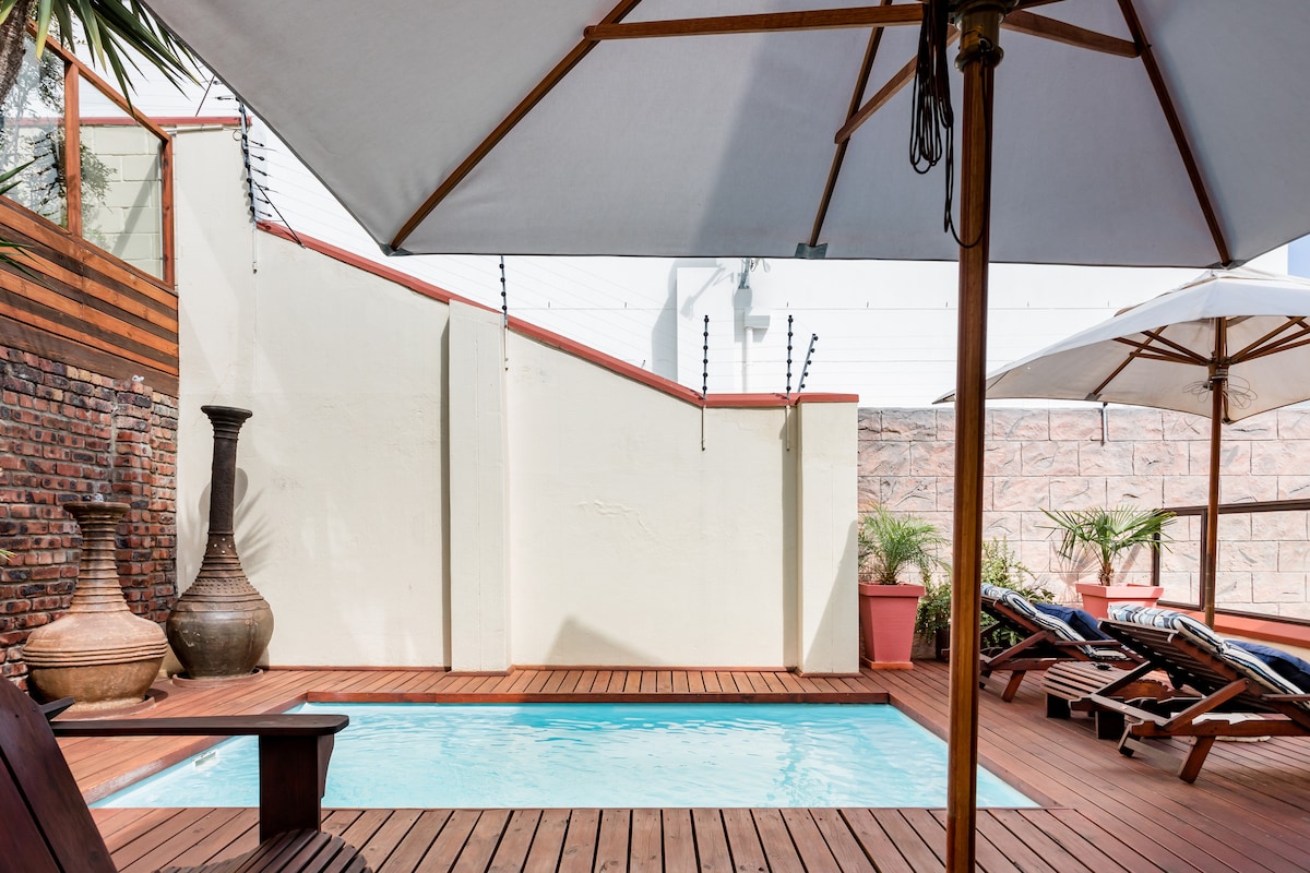 Réveillez-vous dans cette spacieuse maison classée du patrimoine avec vue sur la ville. Notre villa Cape Plantations offre une expérience luxueuse à distance de marche des boutiques, des cafés et de la rue animée de Kloof Street. Profitez du soleil et de la vue imprenable depuis le patio commun ou détendez-vous dans le salon confortable. Il y a une cuisine complète avec arrière-cuisine séparée. Chacune des deux chambres est dotée d'une salle de bain privative avec du linge de lit de qualité supérieure, des couvertures supplémentaires pour plus de confort, des ventilateurs et des appareils de chauffage.