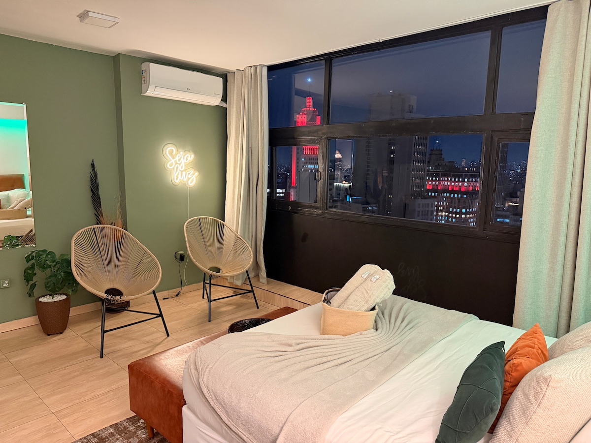 Studio industriel de 35 m² au 39e étage, avec vue panoramique sur la vallée d'Anhangabaú. Environnement moderne avec béton, briques apparentes, bois, métal et une fresque exclusive de Caio Fonseca, apportant identité et authenticité à l'environnement. À proximité des bars, des restaurants, de la route gastronomique de la République, des magasins populaires et des théâtres/musées/centres culturels. Idéal pour les couples, les photographes et les nomades numériques à la recherche de confort et de style dans le centre-ville de São Paulo.