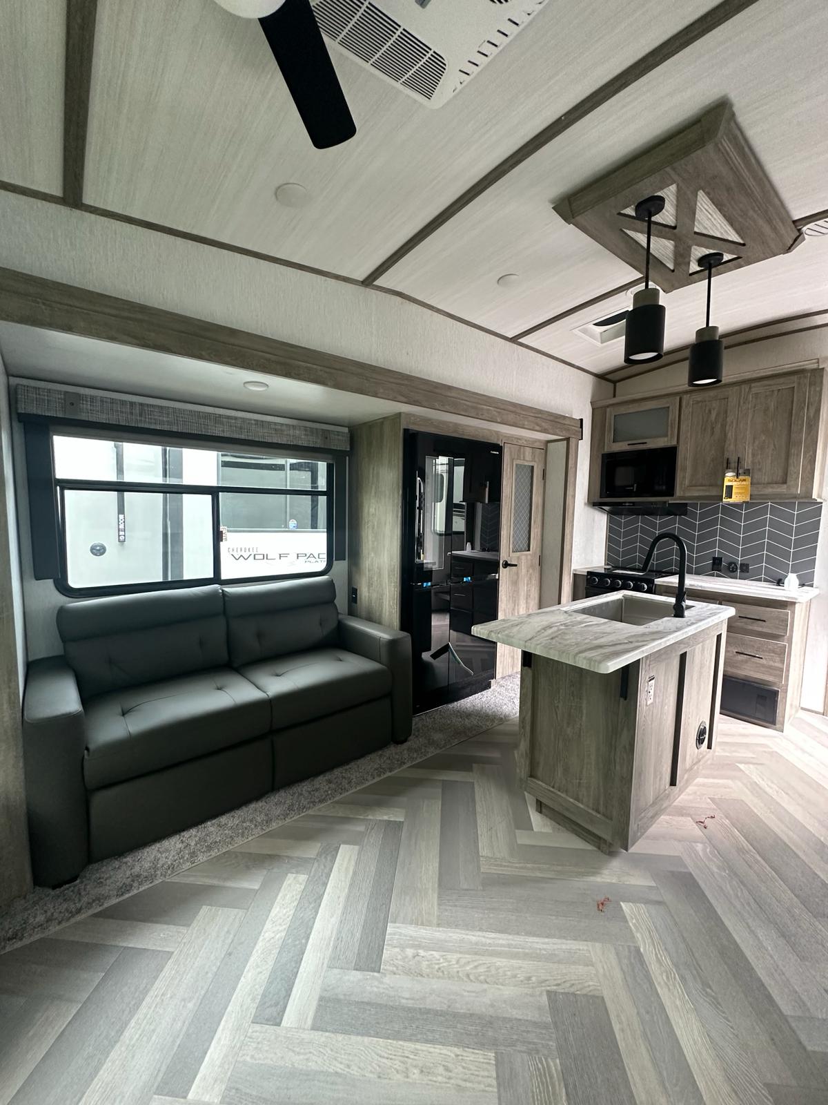 This spacious and modern RV has all the features you need for your next adventure! It can sleep up to 8, with a spacious modern interior, featuring modern appliances, a private Master bedroom, and even an island sink. The Kitchen is equipped with a refrigerator, stove, and microwave. And let's not forget about the private bathroom with a shower and abundant storage for your storage needs. Plus, the large panoramic windows provide amazing views of the great outdoors.