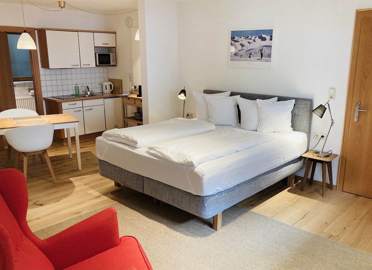 Bel appartement pour deux personnes avec chambre/salon spacieux, cuisine avec table et chaises et salle de bain avec douche/WC et fenêtre. Wifi gratuit. Local à skis avec sèche-chaussures. Le QUELLALPIN avec piscine, fitness, spa est à seulement 150 m. Nos hôtes bénéficient en hiver (d'octobre à mai) d'une entrée GRATUITE exclusive à la piscine et au fitness, en été, nos hôtes bénéficient d'une réduction de 50 %. La taxe de séjour de 3,50 € par personne (à partir de 16 ans)/nuit n'est PAS incluse dans le prix de la location et doit être payée en espèces à l'arrivée.