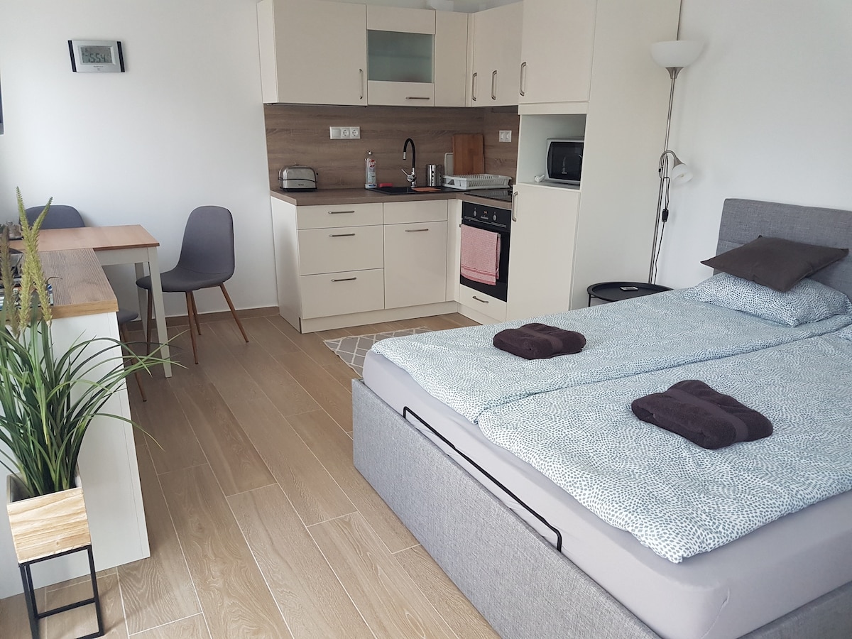 Rechargez vos batteries dans ce petit studio confortable, situé dans un immeuble neuf, calme, avec parking dans la cour, à proximité de la plage et des lieux de divertissement. Hébergement idéal pour les couples ou même les voyageurs solitaires, hiver comme été. Lit double confortable de 160 cm de large avec ressorts bonell, cuisine équipée, douche-bain avec bidet, balcon privé et calme donnant sur la cour intérieure, et un parking fermé dans la cour.