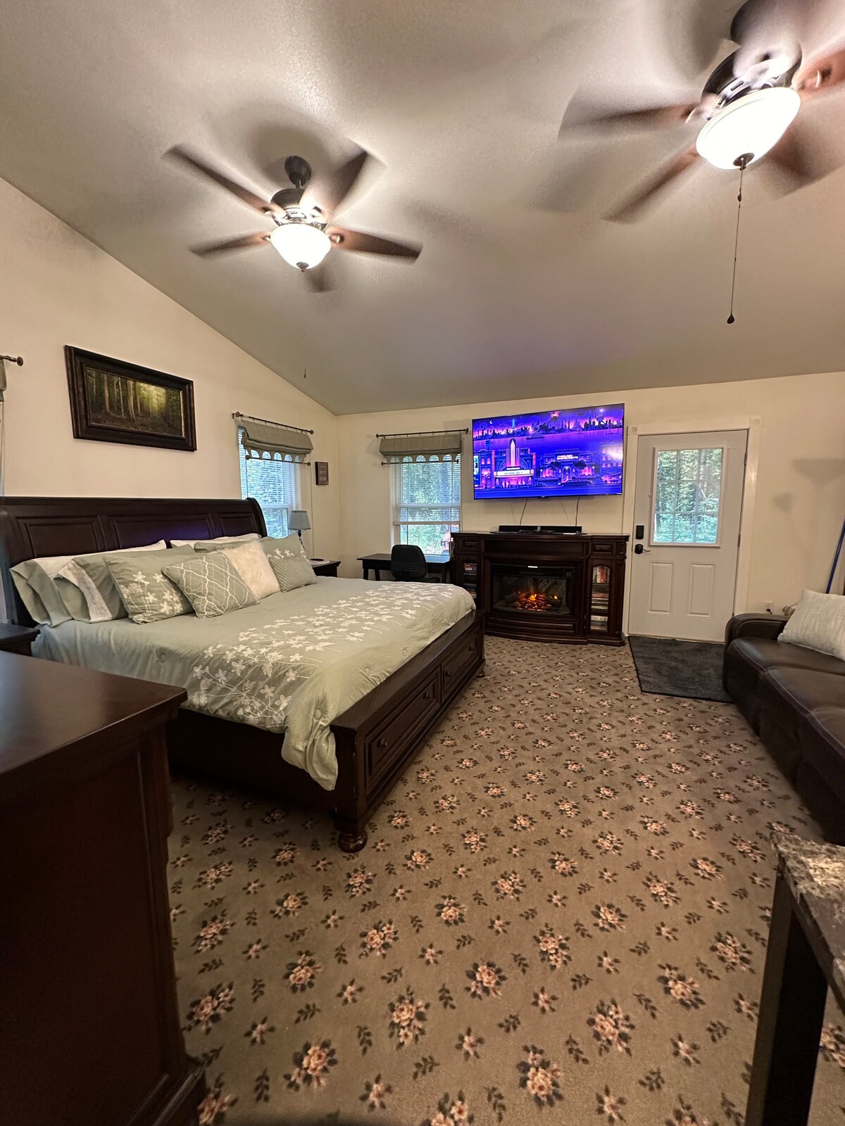 Détendez-vous dans cette suite luxueuse avec (1) « un » lit KING Tempur-Pedic réglable et un jacuzzi. Le logement dispose également d'une connexion Wi-Fi illimitée, d'une cheminée, d'une télévision 65", d'un canapé inclinable en cuir, d'un espace de travail avec chaise, d'une douche à l'italienne, d'une table de toilette, d'une kitchenette équipée avec café, thé, cacao et bars à petit-déjeuner. Entouré de forêts et isolé des voisins, profitez de la tranquillité de la région de Hatchers Pass. Endroit idéal pour les randonneurs et les skieurs car la suite est à quelques minutes des montagnes et des pistes.