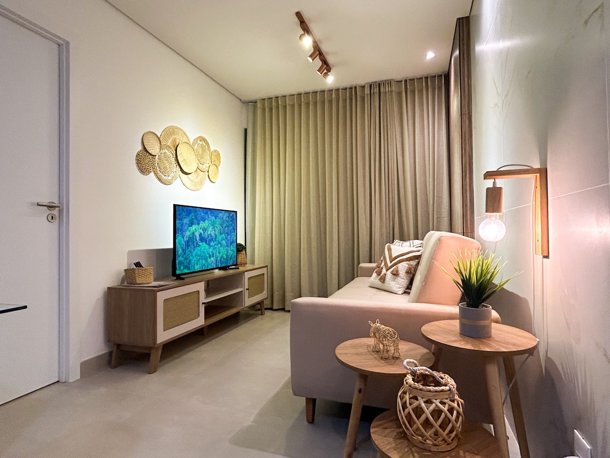 Logement confortable avec vue sur l'océan à Beach Class Salvador à Ondina. 1 suite, 44 mètres carrés, entièrement équipée avec connexion Wi-Fi, télévision par câble, Smart TV LG 60'' et arrivée autonome, café et restaurant, marché, piscine à débordement, coworking, salle de sport et accès exclusif à la plage par la copropriété, qui dispose de chaises longues et de parasols pour que vous puissiez profiter de tout le charme d'une plage privée. Nous préparons cet espace pour que vous vous sentiez chez vous. Bienvenue chez nous !