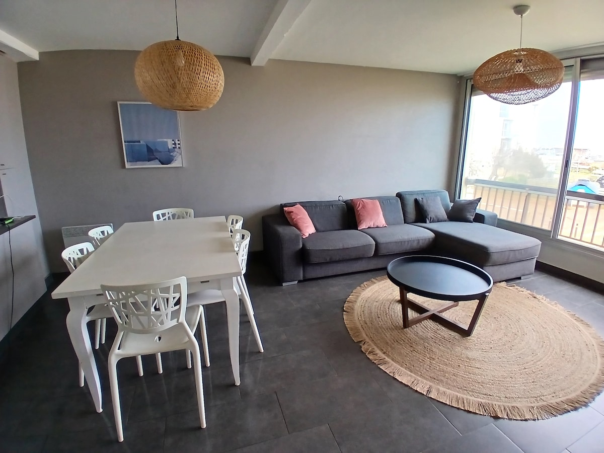 Charmant 2 pièces au 2eme étage Très belle vue mer depuis la loggia. Appartement traversant , refait à neuf, tout équipé dans une belle résidence calme. Place de parking privé et boulodrome au pied de l'immeuble. 10 à 15 min à pied de la plage et des commerces La résidence est à proximité de l'arrêt de bus et du petit train qui vous emmènera gratuitement jusqu'au marché, au port, à la fête foraine ou à la plage.(en saison estivale) DRAPS ET SERVIETTES NON FOURNIS Couettes et coussins fournis
