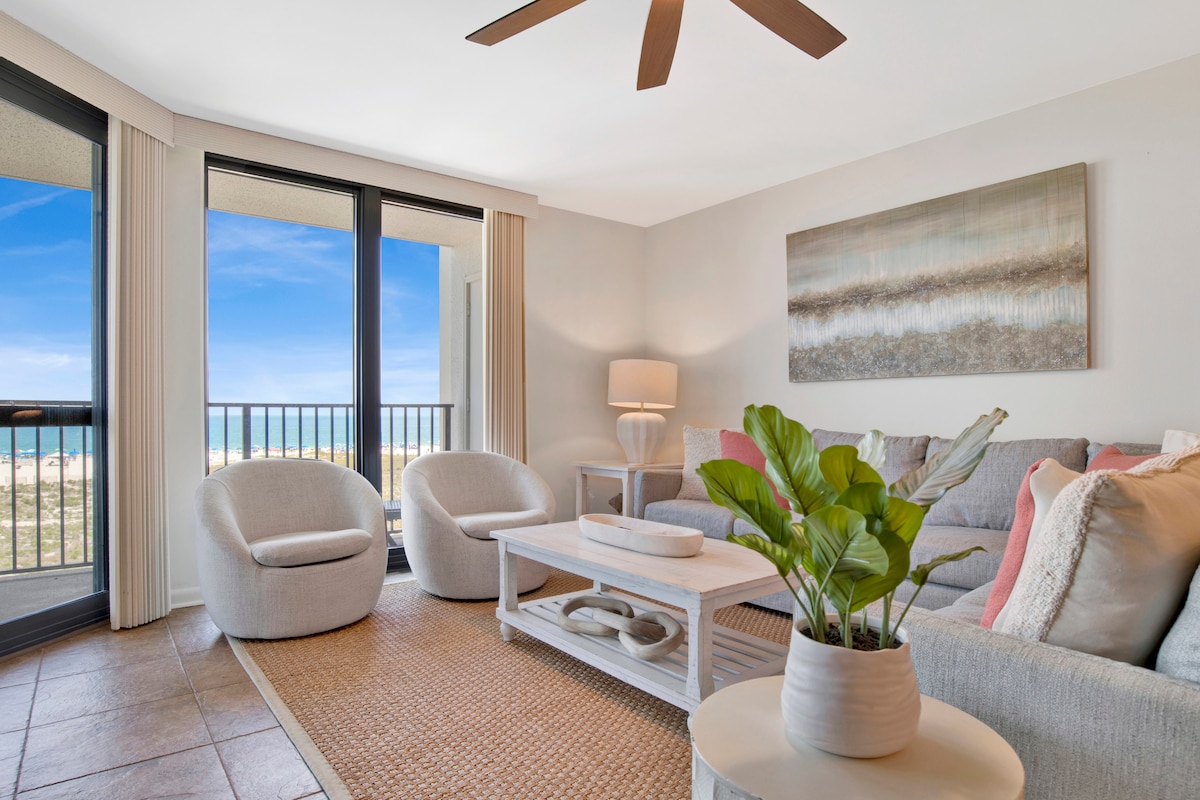 Cet appartement Phoenix 10 méticuleusement entretenu et magnifiquement meublé est l'incarnation de l'élégance et du luxe sophistiqué pour le couple ou la petite famille exigeante qui cherche à se reposer dans un cadre de station balnéaire. Savourez votre café du matin sur votre balcon privé donnant sur la plage et le golfe du Mexique. Situé directement sur la plage ! Stationnement disponible moyennant des frais de 60 $ par séjour. Linge de maison, serviettes et kit de démarrage complémentaire (TP/serviettes en papier, détergent pour vaisselle et shampooing fournis). Âge minimum pour réserver : 25 ans