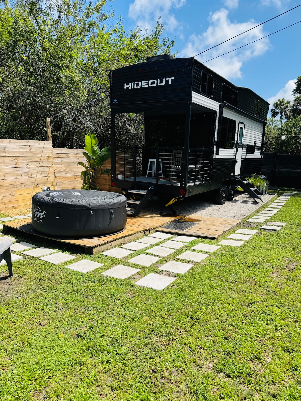 Vous adorerez ce logement unique et romantique. Cuisine complète avec tout le nécessaire pour le chef moderne, douche debout avec un banc, lave-linge/sèche-linge, canapé avec une télévision grand écran, deux lits Queen Size avec surmatelas sur des lofts séparés, portes vitrées coulissantes sur le patio menant au barbecue extérieur et au JACUZZI, ainsi qu'à la douche extérieure chaude et froide. Cette maison a tout ce dont vous avez besoin avec de beaux draps et serviettes, y compris des serviettes de plage et des chaises à utiliser pendant vos vacances dans la belle Vero Beach,🏖️❤️ non loin de la plage. Carmen et Rodney