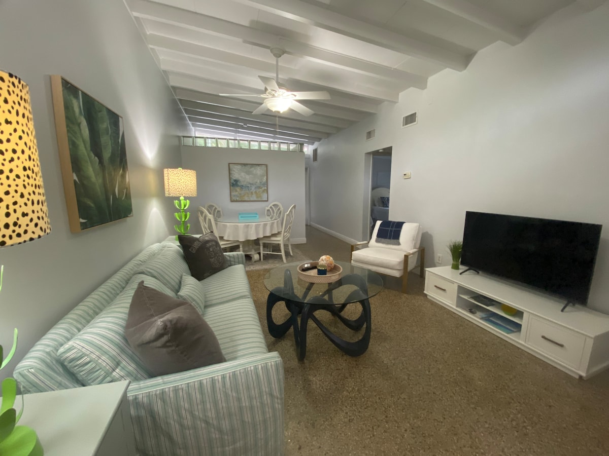 À 2 miles de la 1ère plage (sud). 2 chambres/1 salle de bain côté entier d'un duplex des années 1950 entièrement rénové et entretenu à l'extérieur ; l'unité n'est pas partagée. Un étage et un mur de béton divisant une unité voisine. Climatisation fraîche, chauffe-eau sans réservoir. Situé sur l'une des premières rues de Vero, nommée Royal Palm blvd pour ses palmiers royaux. Excellent emplacement ; à 7 min en voiture du stade Jackie Robinson. Marchez jusqu'aux magasins et restaurants de Miracle mile. Près de l'aéroport de Vero et de Piper. À 1 mile du centre-ville. Hôtes locaux.