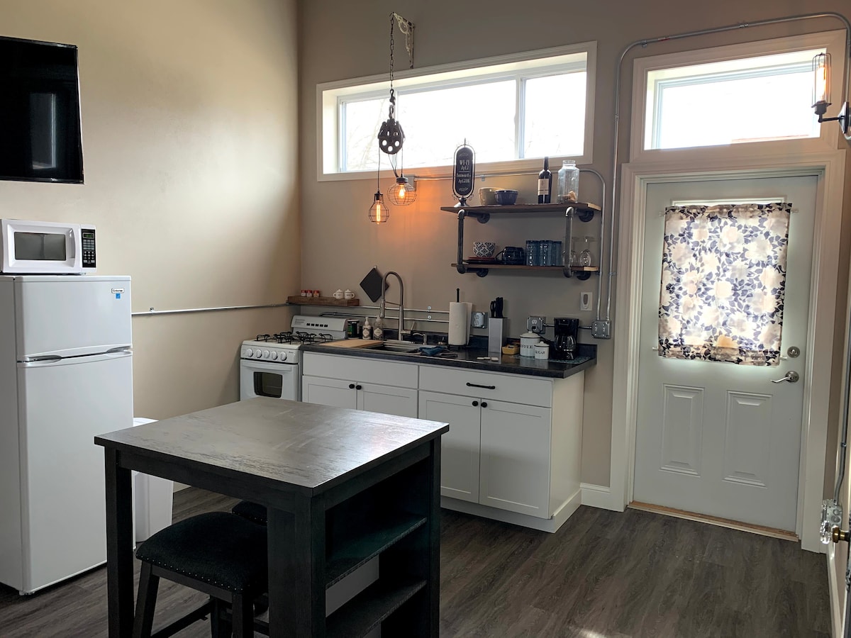 Studio calme et confortable avec douche et salle de bain complètes, réfrigérateur et four grille-pain, cafetière. Le stationnement est disponible au niveau de la rue à l'entrée des appartements, cet appartement est situé au deuxième étage au-dessus d'un bâtiment commercial de la rue principale, en face du gaz d'un Casey. Il est situé sur le même pâté de maisons que la caserne de pompiers et en face de l'hôtel de ville, de la bibliothèque et du bureau de poste.