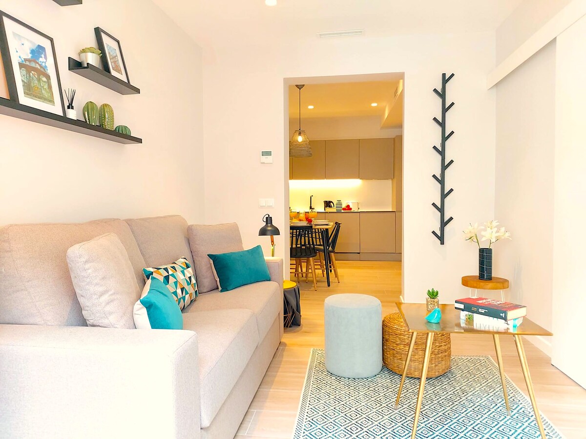 Magnificent 45 square meter apartment in the heart of Madrid. With spectacular design and decoration, spacious areas, and high ceilings, the apartment is equipped with everything you need for your stay in Madrid. The living room has three balconies overlooking the street that provide great brightness to the flat. The bedroom has an en-suite bathroom and a work desk. From the apartment, you can walk to almost all the iconic points of Madrid.