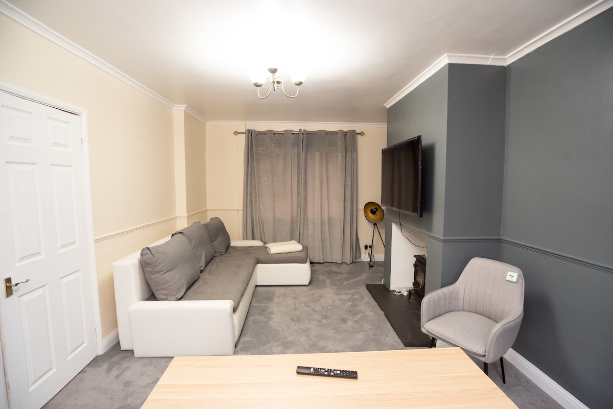 Appartement récemment rénové, spacieux et confortable. Composé d'un grand salon confortable, avec Sky TV et haut débit. Cuisine moderne avec tous les équipements et le confort d'un chez-soi. Salle de bains lumineuse avec douche électrique à l'italienne et de nombreux rangements. Chambre double de bonne taille avec armoire triple, une grande chambre simple/bureau avec porte menant à la terrasse privée. À moins de 5 minutes à pied du supermarché local, de 3 pubs, de Costa, de l'hôpital Kings Mill et du lac. À 5 minutes en voiture du centre de Mansfield.