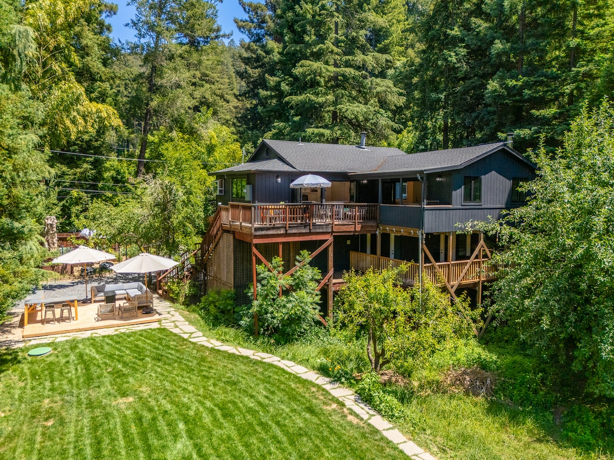 Juniper Haus: Experience California cool in the redwoods. This 3-bed, 2.5 bath gem blends minimalist design with nature. Enjoy soaring ceilings, designer furniture, and a gourmet kitchen. Relax in the hot tub, on the stylish patio, or by the fireplace in the living room overlooking ancient trees and Korbel vineyards. Plush beds ensure restful nights. Steps from a private river beach, minutes from wineries and downtown. Perfect for design lovers, families, and friend groups.