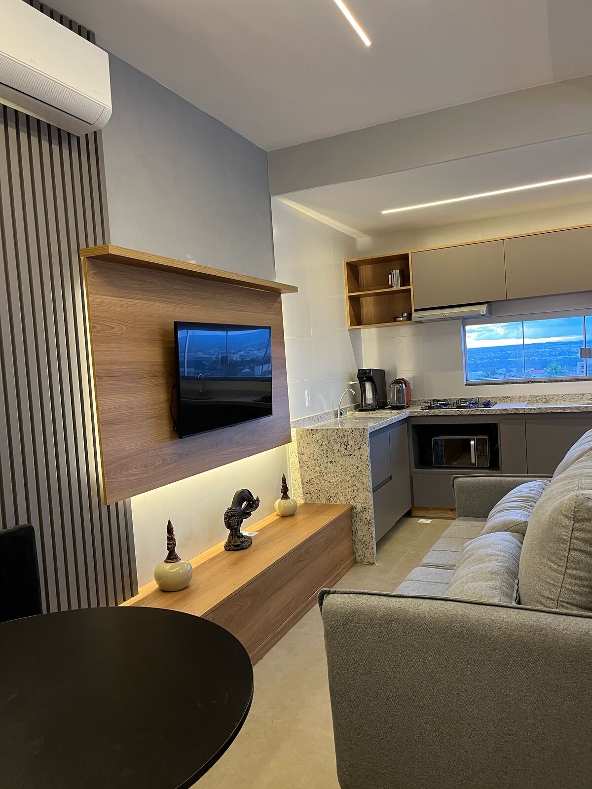 Appartement de haut standing à Sahori College, 100 % meublé, climatisé, avec ascenseur et garage. Idéal pour les loisirs ou le travail, à seulement 300 m de l'UNIRV et de l'Av. Brasília. Appartement en résidence avec sécurité par caméra, buanderie collective, salle de sport, ascenseur, 2 salles de coworking, toit-terrasse avec barbecue et 2 espaces communs sur le toit. Wifi sophistiqué et rapide, cuisine équipée, 2 TV Smarts, canapé avec porte vitrée et port USB et lit confortable. Idéal pour les étudiants, les professionnels et les visiteurs.