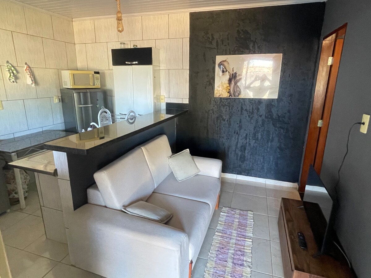 Apto203 Confort et emplacement à Formosa-GO Aconchegante, fonctionnel et très bien situé ! Notre apê est à 500 m de l'UNIRV, de l'IESGO, de l'hôpital régional, du SAMU, du Forum, de l'OAB, des supermarchés Day by Day et Atacadão, en plus du Restaurante Mediterranium Gastronomia International Idéal pour le travail, les études ou le repos, l'appartement est complet et récemment décoré. 2 chambres (1 suite climatisée), 2 salles de bain, salon avec canapé-lit et télévision, cuisine équipée et connexion Wi-Fi rapide. Peut accueillir jusqu'à 4 personnes confortablement.