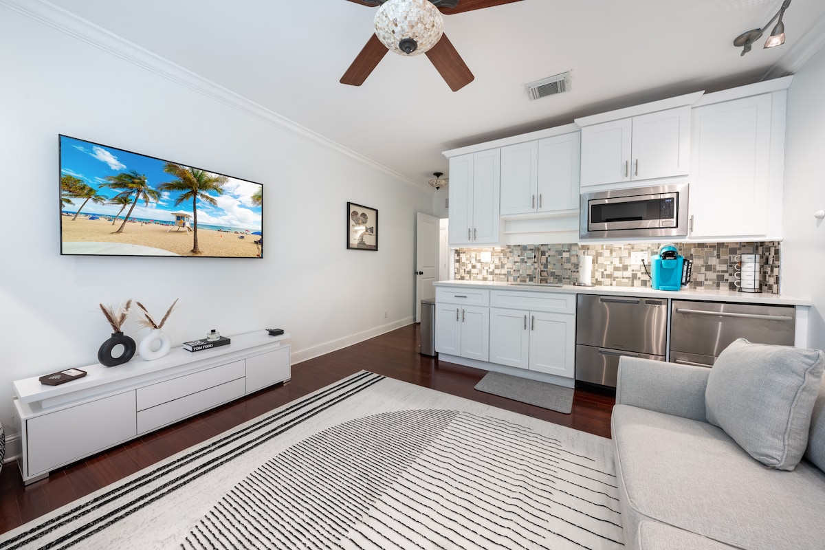 Studio avec lave-linge et sèche-linge à l'intérieur. La cuisine est petite mais entièrement équipée pour une vraie cuisine. Faire les courses est facile avec une épicerie de taille moyenne (Publix) et une grande pharmacie (CVS) à quelques pas seulement. Climatiseur sans conduit pour le confort. Parking gratuit, facile et hors de la rue pour une voiture. À 1,8 miles de la plage, à 5,8 miles de l'aéroport FLL. Sunrise Blvd (pour un accès rapide à la plage, à l'aéroport et à l'I-95) se trouve à seulement un pâté de maisons. Cuisine entièrement équipée Wifi Télévision connectée 4K