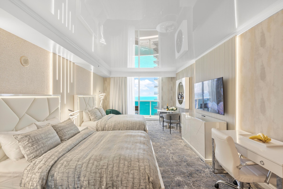 Resort de luxe à Sunny Isles Beach🏖️ 18001 Collins ave Magnifique studio exclusif – 25e étage • Vue imprenable sur l'océan avec balcon privé • Douche et baignoire complètes dans une salle de bain spacieuse • Entièrement rénové avec un design unique • Seulement 2 chambres comme celle-ci dans tout le complexe avec un BAR GRATUIT entièrement approvisionné en boissons alcoolisées et plus encore • Peut accueillir jusqu'à 4 personnes : 2 lits Queen size • Gestion privée 💳 Frais de séjour de l'hôtel Trump : 135 $ / jour +7 % de taxe PAR CHAMBRE, comprend 2 cartes et l'utilisation des équipements.