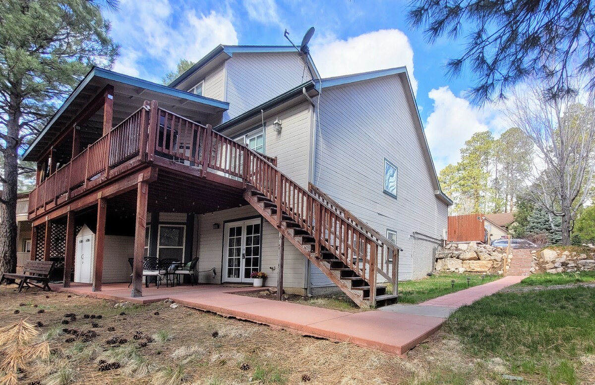 Séjour confortable près de Flg et Sedona. Profitez d'un jacuzzi extérieur au milieu des pins dans cet appartement propre, confortable, spacieux et privé au sous-sol de ma maison. Le quartier boisé est à dix minutes au sud de Flagstaff. Visitez Sedona, Snowbowl et Grand Cnyn. Lumière naturel magnifique partout. Détendez-vous dans le jacuzzi extérieur (avant douche requise - peignoirs dans le placard) ou à l'intérieur sur la balançoire unique sur le canapé. Super matelas king size et literie confortable. Quartier convivial avec belle randonnée en forêt. Cuisine entièrement équipée