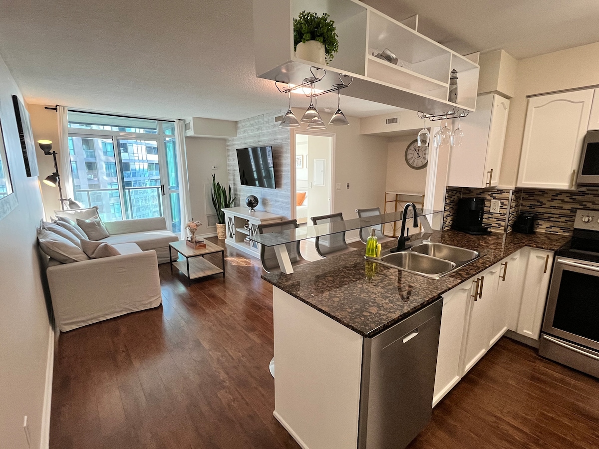 Experience downtown Toronto in a stylish condo! Start your day in a bright kitchen & enjoy coffee on the balcony. Relax with Netflix after exploring the city. Walk to CN Tower, Rogers Centre, Ripley’s Aquarium, Exhibition Place, restaurants & waterfront. Full kitchen, Keurig, 2 desks for work. Building features pool, hot tub, sauna, gym, seasonal rooftop BBQ, free parking & self check-in. Discounts on stays of 7+ nights & non-refundable bookings. Book your unforgettable Toronto getaway today!