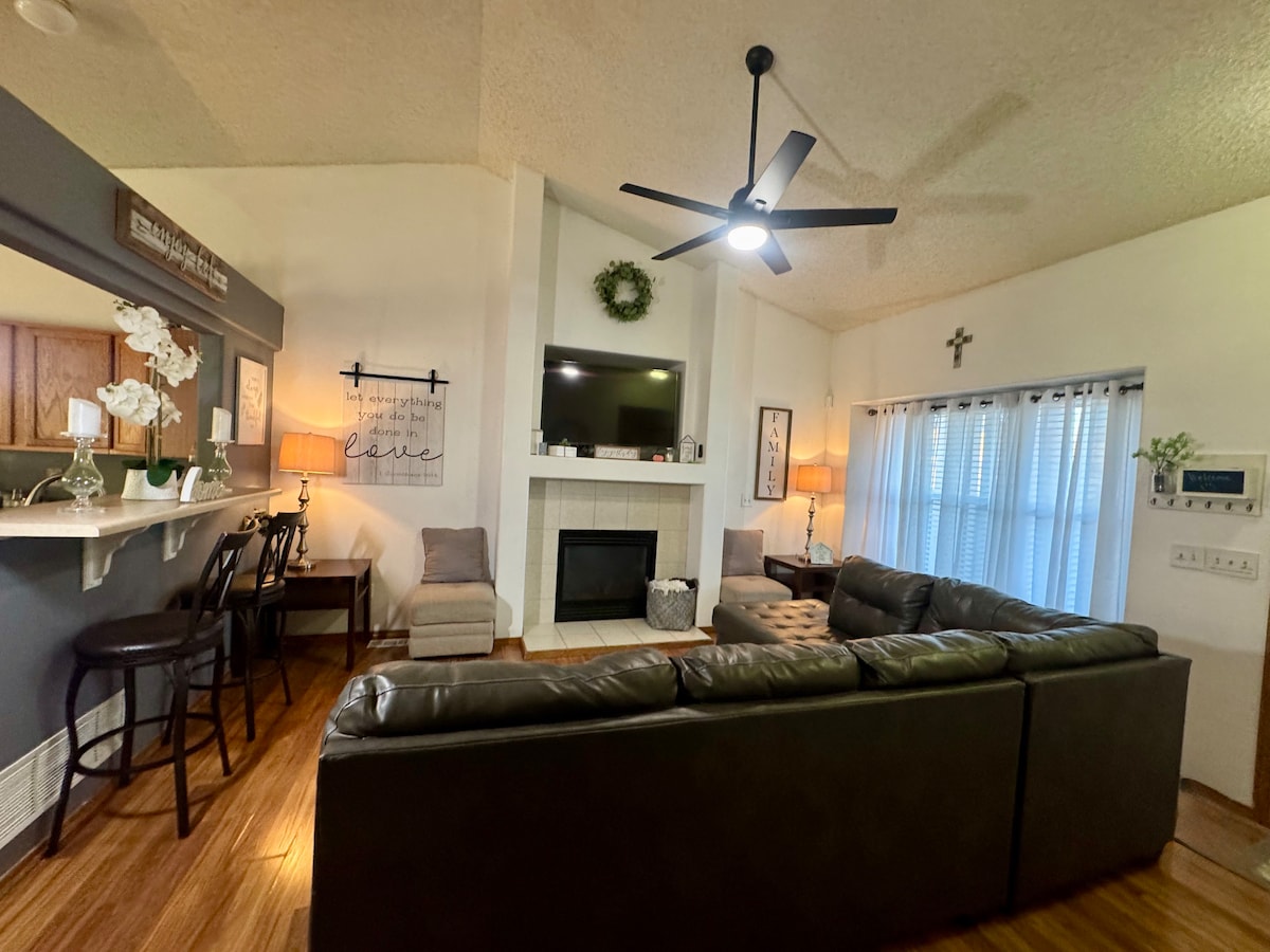 Cette spacieuse maison de style ranch de 4 chambres et 2 salles de bain avec sous-sol est l'escapade parfaite au Colorado pour vous ! Elle est équipée de nombreux équipements de base comme une connexion Wi-Fi, la climatisation centrale, un lave-linge séchant, un barbecue, un patio en béton estampé en couleur avec mobilier d'extérieur, des foyers, une télévision de 65 pouces avec PS4 et bien plus encore. Cette retraite est située à Fountain, CO, à quelques minutes de Colorado Springs et d'autres attractions locales. Chaque chambre est entièrement meublée. Nous avons également un futon et des lits gigognes si nécessaire.