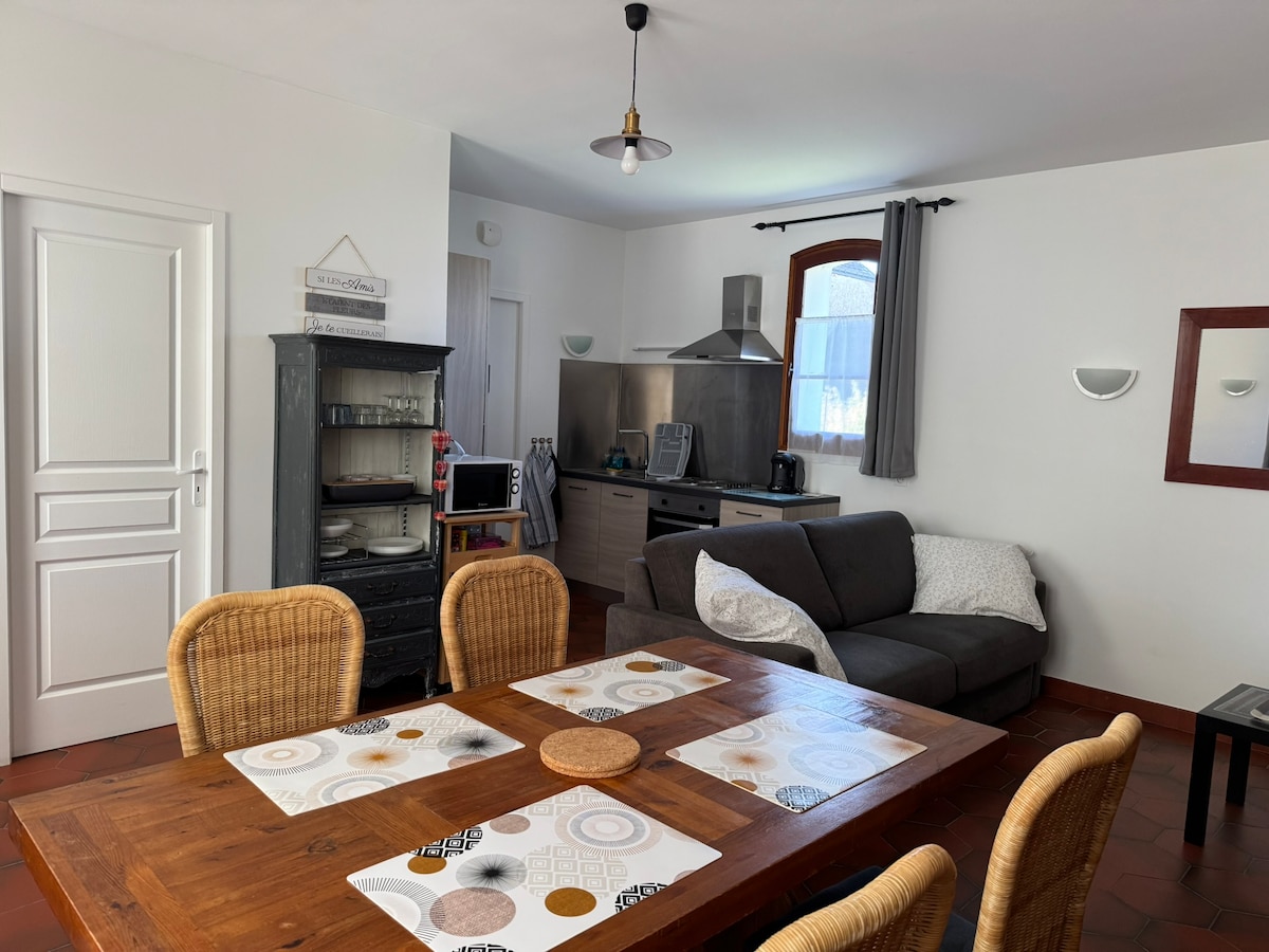 situé dans la cour des propriétaires dans un hameau calme et tranquille. récemment restauré le logement comprend au rez de chaussé 1 grande pièce à vivre avec une cuisine aménagée, un coin repas, un coin salon télévision avec une grande cheminée (hors service et un canapé 1 wc, et une salle de bain avec douche à l'italienne un escalier qui monte à une grande chambre à proximité du château de Chenonceau, Amboise, Montpoupon etc...et du magnifique zoo de Beauval randonnées dans les vignes