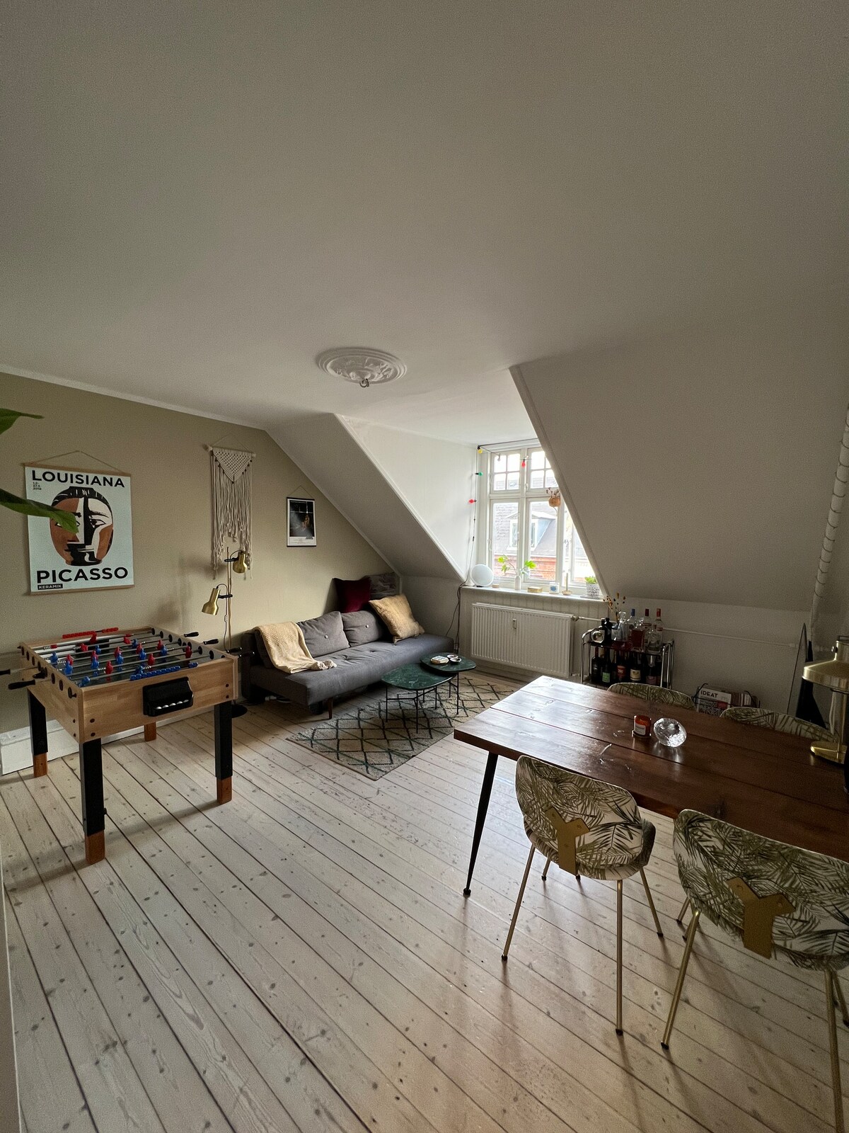 Appartement confortable de 2 pièces avec grand balcon, avec une touche créative et personnelle. Situé au dernier étage et avec un grand balcon. Plein de lumière, de charme, de plantes et d'instruments. Cuisine et salle de bain dans leur forme originale des années 1970. 1 chambre, 1 salle de bain, 1 entrée/hall, 1 grand balcon et 1 grande cuisine et salon. Dans la partie animée de Copenhague appelée Nordvest, à 850 m du métro, à 180 m du bus directement vers le centre-ville, à 700 m de la zone de stationnement gratuite, à 500 m de la location de vélos.