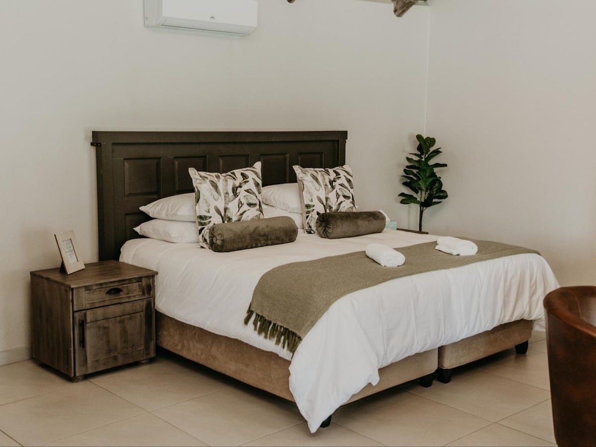 Deux chambres - 4 personnes, TV et DStv, climatisation Chambre principale avec lit Queen Size, salle de bain et douche attenantes Deuxième chambre 2 lits simples PAS attenante, mais dispose de sa propre salle de bain avec baignoire, douche, lavabo et toilettes. Kitchenette - Petit salon et coin repas.