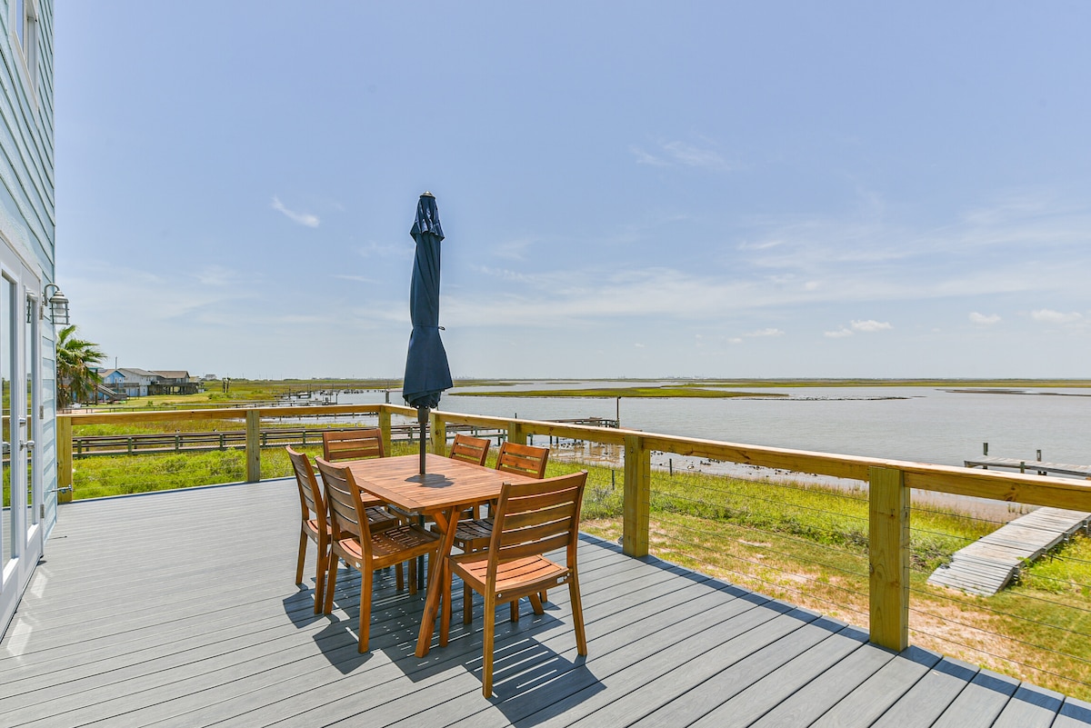 Maison au bord de l'eau au coucher du soleil, vue imprenable sur les couchers de soleil sur l'eau, quai de pêche, Internet haut débit, climatisation centrale. Séjour de luxe dans la fabuleuse plage de Surfside Beach, TX. Pour toute la famille - près de la plage Magnifique vue à 360 degrés depuis la maison frontale du canal La plage est à 3 minutes en voiture. Vue à 360 degrés sur Surfside depuis le nid de corbeau. Détendez-vous avec une boisson fraîche sur la terrasse. Vous aimez la pêche? L'endroit idéal pour pêcher ou pêcher le crabe directement sur la terrasse arrière. Des kayaks sont à votre disposition