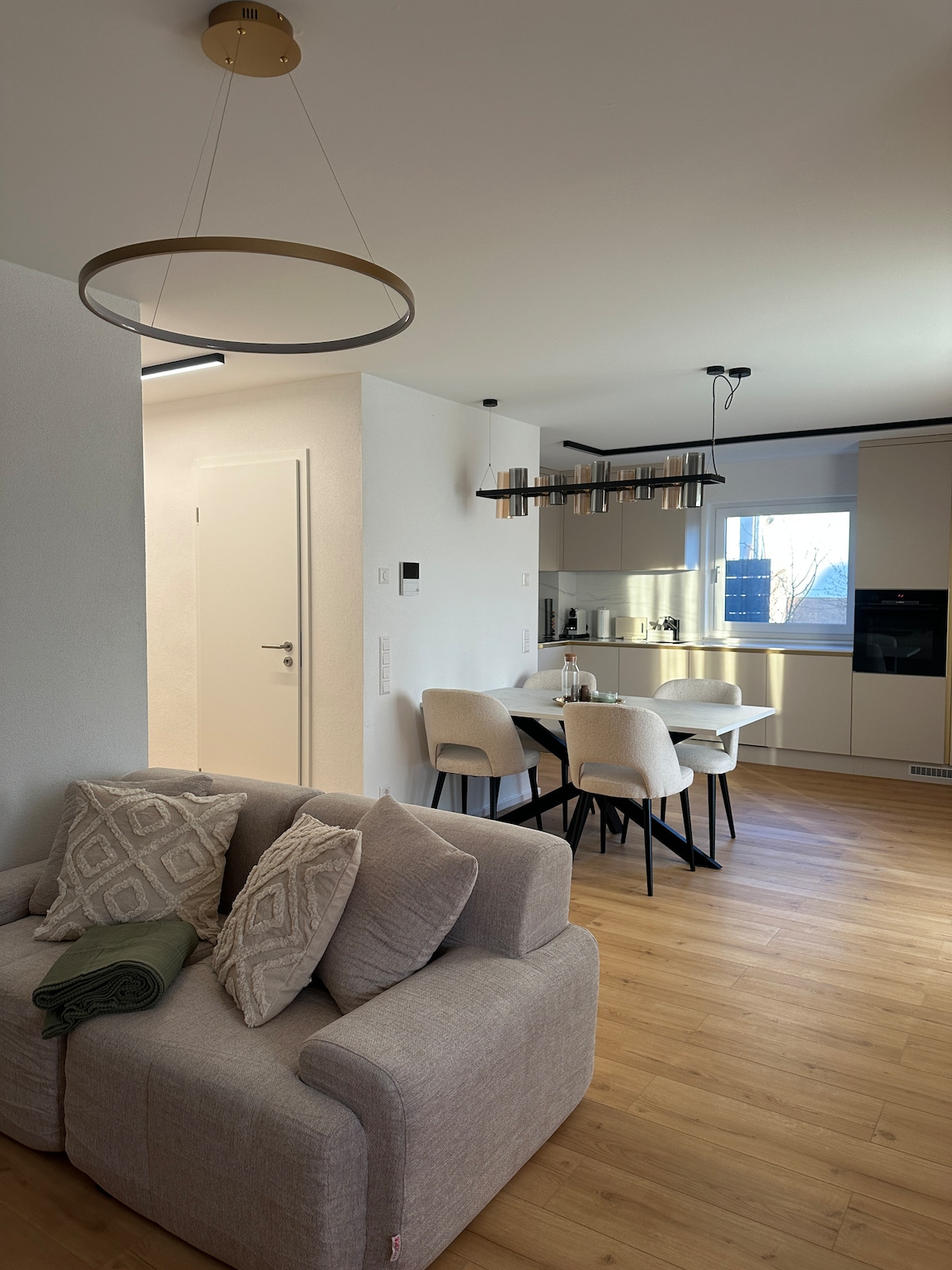 Bel appartement de 105 m² au 1er étage avec de grands balcons orientés plein sud et ouest, cuisine moderne avec équipement de base, salon et salle à manger confortables. Avec accès direct depuis l'espace de stationnement séparé devant la maison, avec prise de raccordement pour voiture électrique sur demande. À proximité de la gare et de la piscine extérieure, mais pas sur une route de transit. Proche à la fois de belles zones de loisirs de proximité, mais aussi de l'autoroute, de grands centres commerciaux et d'installations sportives et de fitness. Convient pour des vacances ou des voyages d'affaires.