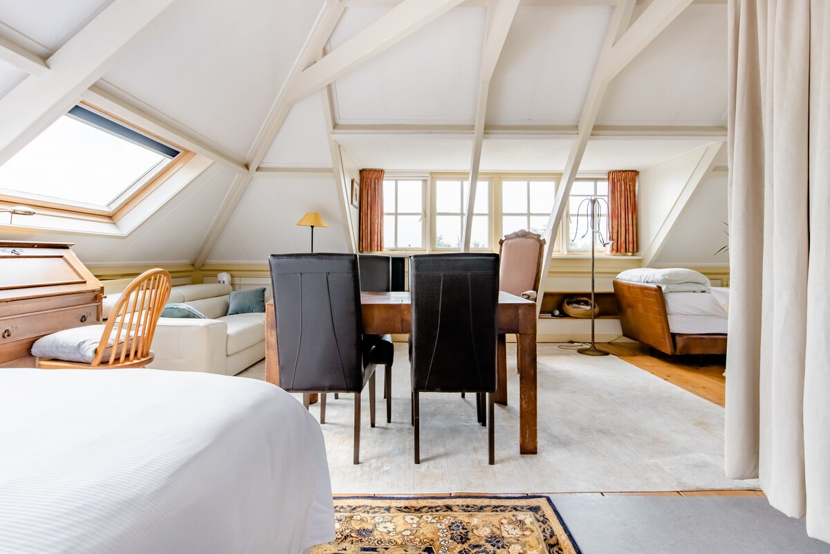 Studio confortable dans une maison sur le canal et galerie d'art moderne située dans le village historique de 's-Graveland près d'Amsterdam et d'Utrecht. Studio meublé pour 3 adultes partageant confortablement une chambre ou un couple avec un maximum de deux enfants, mais pas d'animaux de compagnie. Vue sur le parc botanique directement à votre porte. Votre hôte et galeriste d'art propose des visites spécialisées dans les sites historiques locaux d'intérêt.