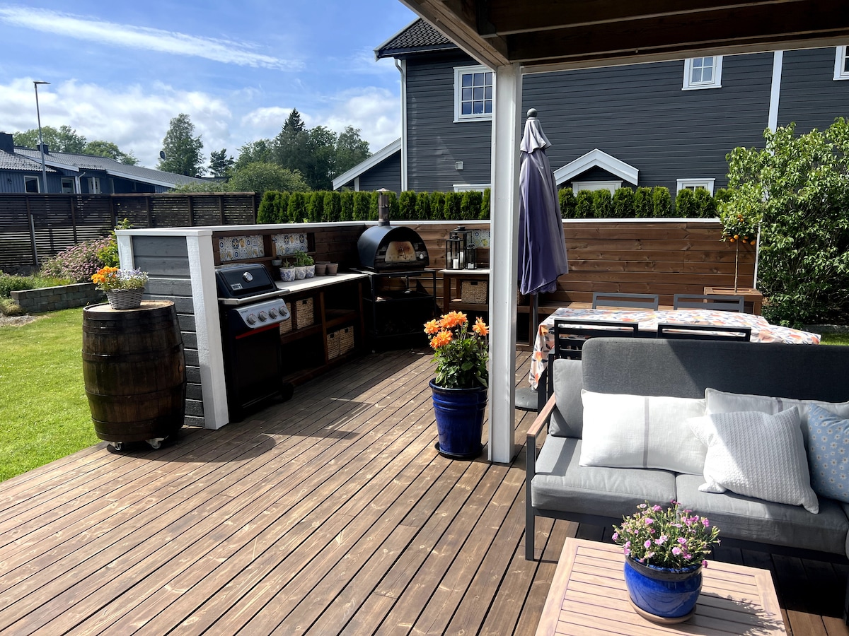 Maison très confortable avec grand patio meublé. Courte passerelle vers tout, arrêt d'autobus, magasins et offres de services, quai de ferry et la plus belle plage de sable de Nesodden. Carport avec chargeur pour voiture électrique, grand terrain de randonnée et chiens bienvenus. Adapté aux enfants. 3 chambres et salon loft. Haut débit et télévision. Cuisine bien équipée.