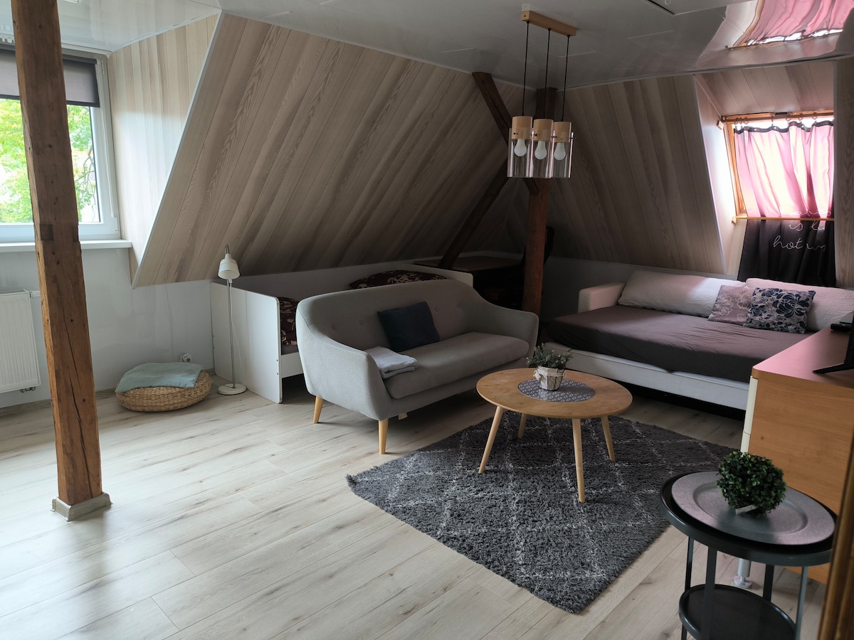 Chambre individuelle - petit appartement mansardé avec entrée indépendante depuis le couloir (33 m2), couloir et escalier partagés avec les propriétaires de la maison. Équipement de cuisine - réfrigérateur, four à micro-ondes, plaque vitrocéramique, bouilloire, grille-pain, évier et lavabo. Parking devant la maison dans une rue calme. Emplacement de la maison - à environ 15 minutes à pied du centre-ville, transports en commun à environ 300 mètres. Possibilité de s'asseoir dans le jardin sous la pergola, de préparer de la viande sur un barbecue à gaz, d'utiliser une pierre de granit ou un fumoir (pour les séjours de 2 nuits ou plus).