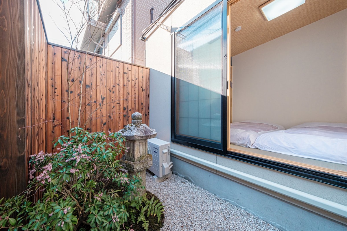 Chambre à coucher japonaise avec jardin. 11 minutes de la gare de Kyoto en train Kintetsu. Café dans la maison de ville. Propre et sécurisé, près de la gare desservie par 2 lignes de train privées. À 1 minute à pied du magasin de proximité !