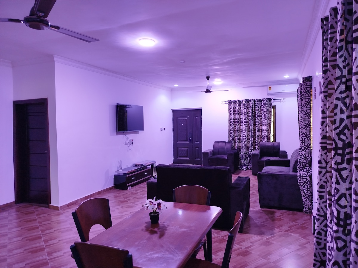 Vous aurez toute la maison de 3 chambres avec complexe pour vous. Il se trouve à environ 26 minutes en voiture de l'aéroport international de Kotoka. D'après un commentaire qui disait que c'était mieux, « Grande villa à l'intérieur comme à l'extérieur avec une bonne sécurité et un bon emplacement parmi les habitants amicaux et divers petits magasins. À seulement 5 minutes à pied de la route principale avec d'excellentes liaisons de transport par bus/taxis vers d'autres parties du Ghana. »