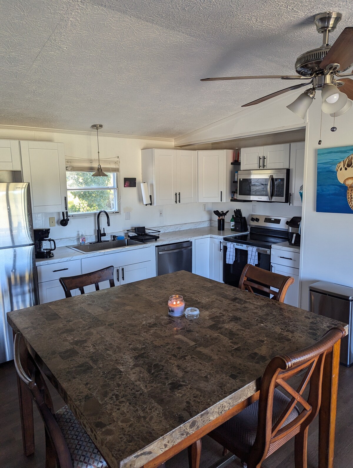 Your family will be close to everything when you stay at this centrally-located place. A newer 2000 square-foot home welcomes you amidst pine trees in the heart of downtown Alachua on Main Street. This expansive and comfortable three bedroom, two bathroom home, is perfect for hosting. Enjoy all the comforts you would expect in your own home and more with free fast Tesla and EV chargers on site. A huge 4K 65-inch smart TV, with JBL surround sound speakers.