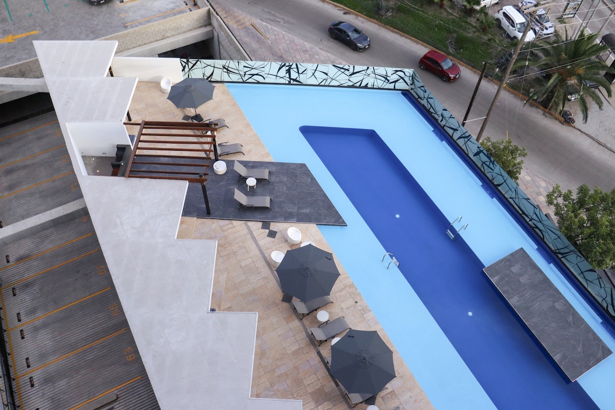 **Bienvenue dans votre oasis urbaine à Tijuana !** Évadez-vous dans notre luxueux appartement de 2 chambres, parfaitement situé au cœur du quartier le plus sûr et le plus recherché de Tijuana, avec une sécurité 24h/24 et un accès contrôlé. Préparez-vous à découvrir la quintessence de la vie urbaine avec tout le confort d'un chez-soi. Restez actif et énergique dans la salle de sport, avec un studio de yoga, et n'oubliez pas de visiter le salon sur le toit, où vous pourrez déguster un verre de vin tout en profitant d'une vue imprenable sur la ville.
