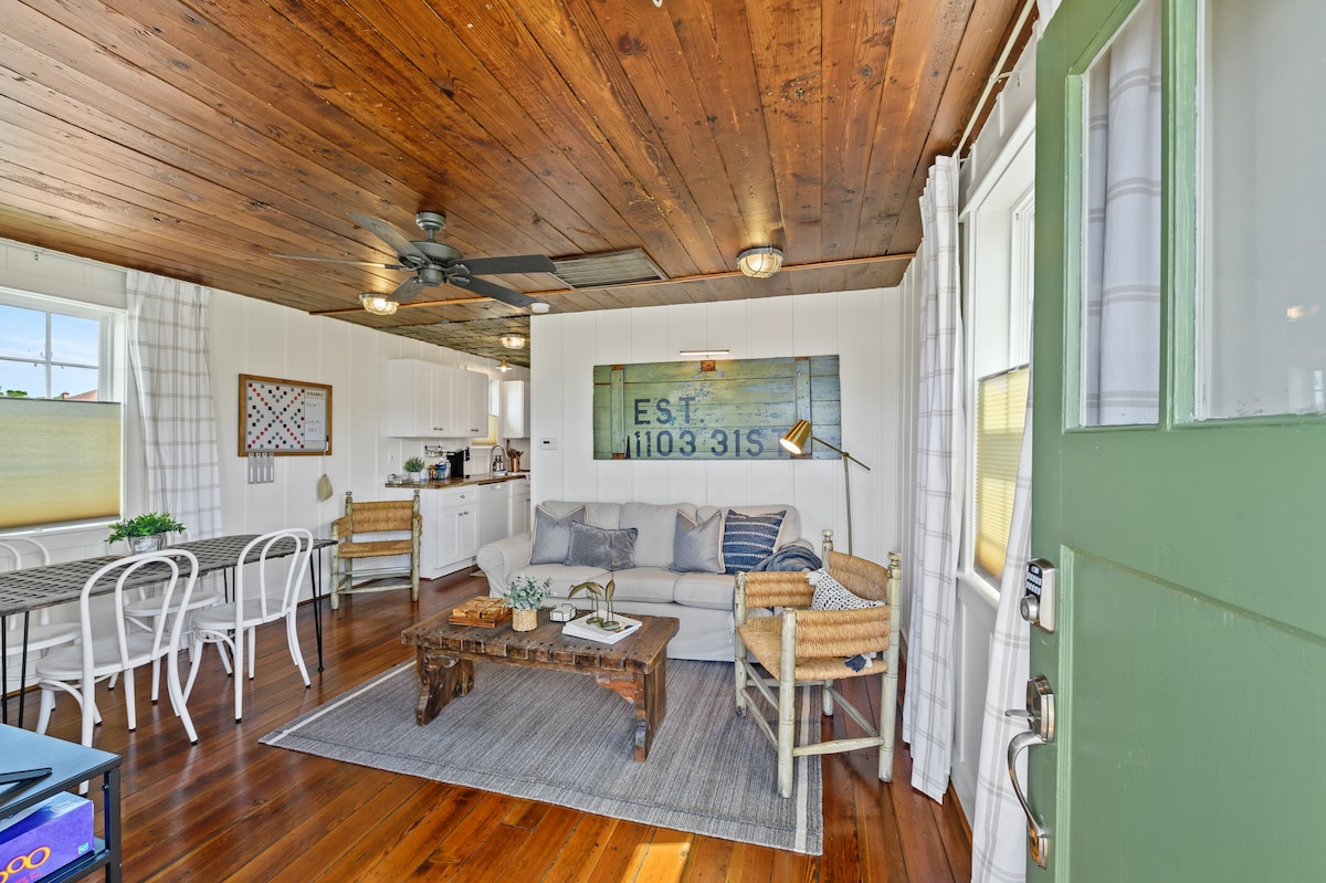 Découvrez la véritable hospitalité dans mon cottage de style anglais en bord de mer. L'espace ressemble à une suite confortable dans un hôtel haut de gamme. À l'intérieur, vous profiterez d'une ambiance de chalet confortable, d'un lit King size avec des draps de luxe, d'une kitchenette entièrement équipée et d'un coin repas pittoresque, d'un combo baignoire et douche dans la salle de bain. Profitez de la brise chaude du golfe depuis le patio privé. Notre spécialité est de vous fournir un espace intime pour créer de beaux souvenirs. À quelques minutes de la plage 🏖️ et de tout ce que Galveston a à offrir.