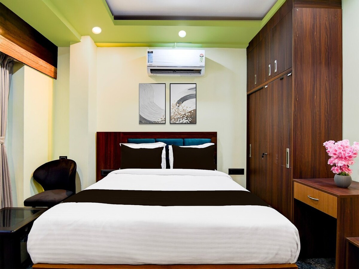 Un « séjour » parfait où vous et votre famille pouvez profiter d'une paix dans un environnement accueillant. Il s'agit d'une chambre simple climatisée, avec lit double, une table d'étude et une chaise, une armoire avec miroir attaché et un casier aussi, pour garder vos objets de valeur en toute sécurité. La chambre est attachée à une cuisine privée, une plaque à induction et des ustensiles de base pour votre usage. Un espace repas attenant dispose également d'une table à manger 4 places et d'un réfrigérateur.