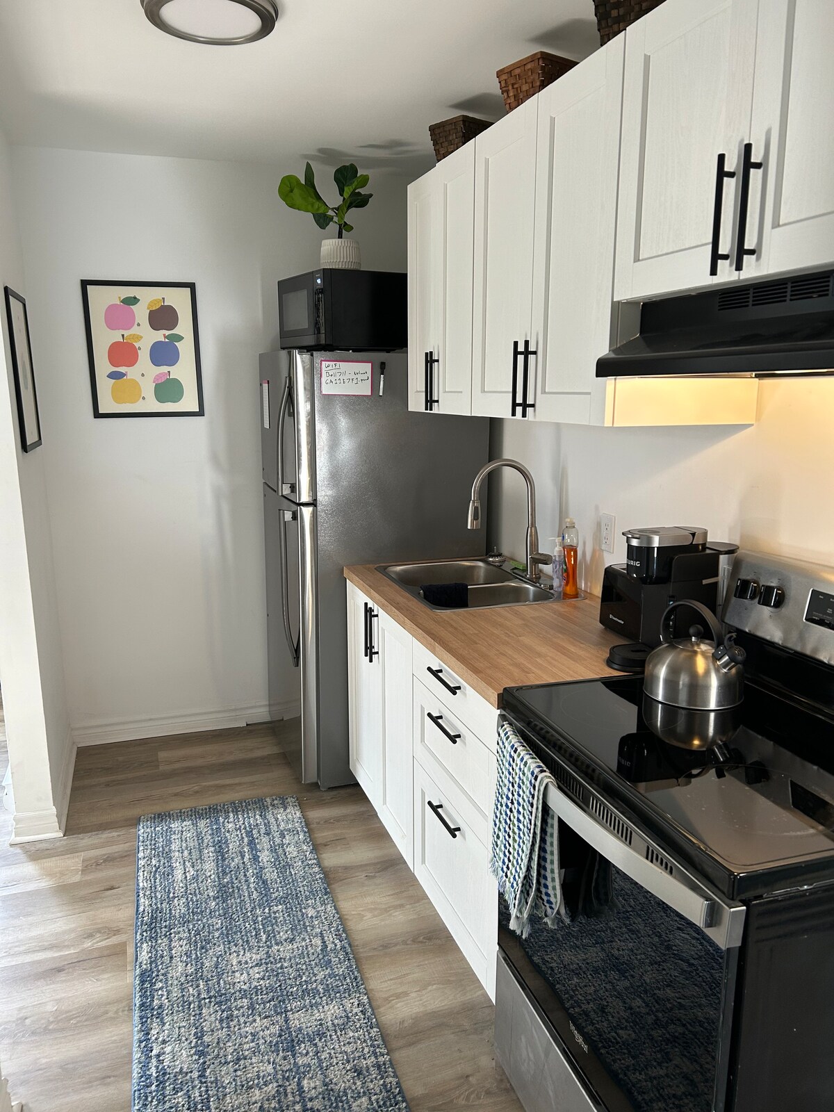 Cet élégant appartement de 2 chambres est situé à Morris Village, Rockland. Il dispose d'une entrée latérale privée et d'une petite cour, d'un aménagement ouvert du foyer, d'une salle à manger, d'une cuisine équipée et d'un espace bureau. Le salon confortable dispose d'une télévision intelligente, de jeux de société, d'un foyer au gaz et d'un canapé-lit. La chambre principale offre un lit queen size, un placard et une télévision intelligente. La 2e chambre dispose d'un lit double et d'un placard spacieux. Vous pourrez profiter de la baignoire ou de la douche fermée. Wifi, lave-linge et sèche-linge, planche à repasser, 1 place de parking pavée incluse.