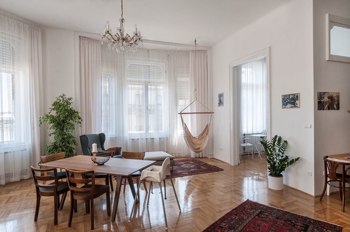 When you can lounge with a glass of wine or sip from a cup of hot coffee on a spacious flat while admiring a dream-like view of the Hungarian Parliament & Danube river, then, why not? Newly refurbished, this historical flat is located in the heart of the city (metro-tram, restaurants cafes, and supermarkets all a stone's throw away). It's THE perfect base for friends, families, and couples visiting iconic Budapest. Many fell in love with this rare and authentic space, and we hope you will too!