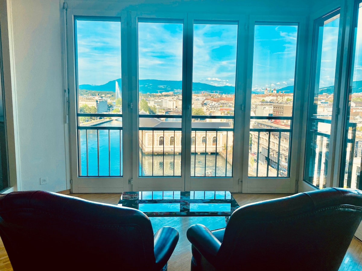Large apartment with a magnificent view of the Jet-d'Eau from the balcony and loggia! Two "king size" bedrooms with 55-inch Oled TV and two separate bathrooms, an equipped kitchen and an office with a 34-inch screen, high speed wifi access and a scanner-printer. High standing building, secure with underground private parking and a direct access to the flat. The apartment is located at 5 minutes walk from the hotel Mandarin Oriental in Bel Air, the main train station (Cornavin) and Geneva-City.