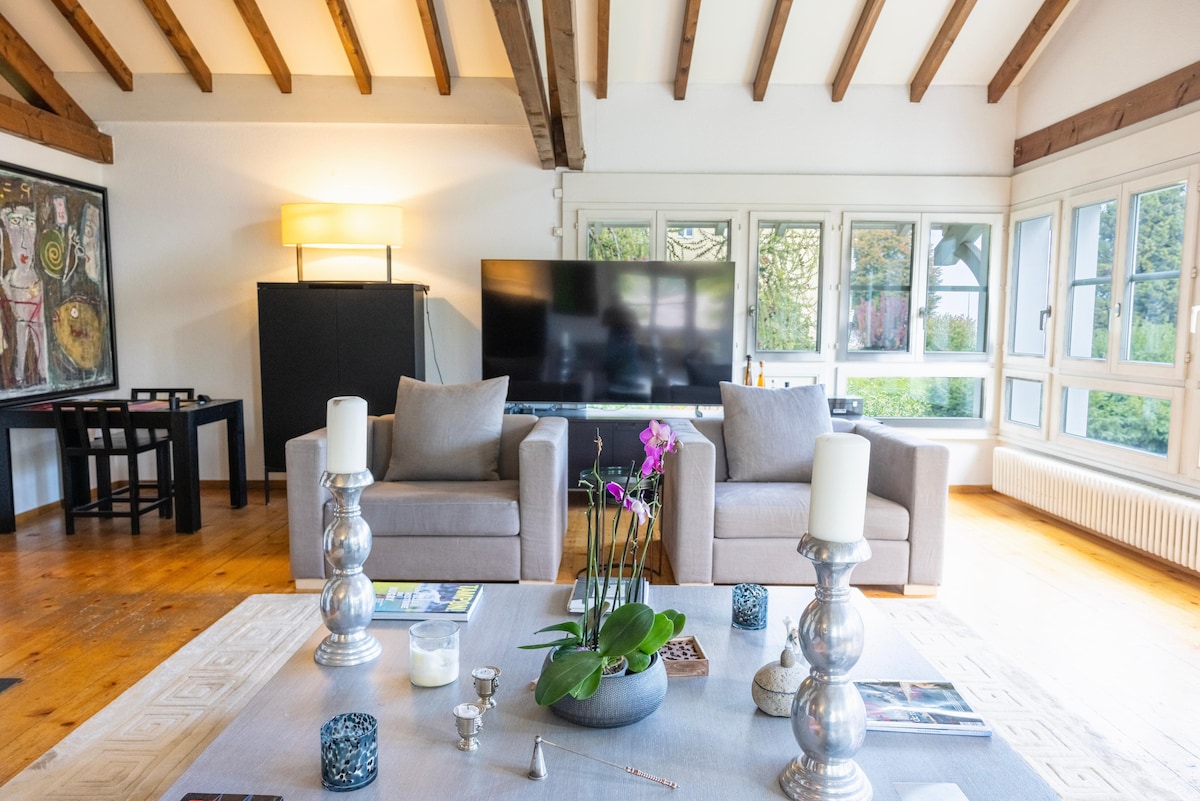 Bienvenue dans notre superbe maison conçue par un architecte à Genève, dans le quartier paisible de Cologny. Cette retraite unique peut accueillir confortablement jusqu'à 10 personnes. Que vous soyez en voyage d'affaires ou à la recherche d'une escapade paisible, c'est le point de départ idéal pour votre séjour à Genève. Profitez d'une vue panoramique sur le lac Léman depuis la propriété, détendez-vous dans le jardin privé ou profitez des 3 places de stationnement. Notre maison offre confort, style et une touche de tranquillité, tout en étant à proximité de la ville.