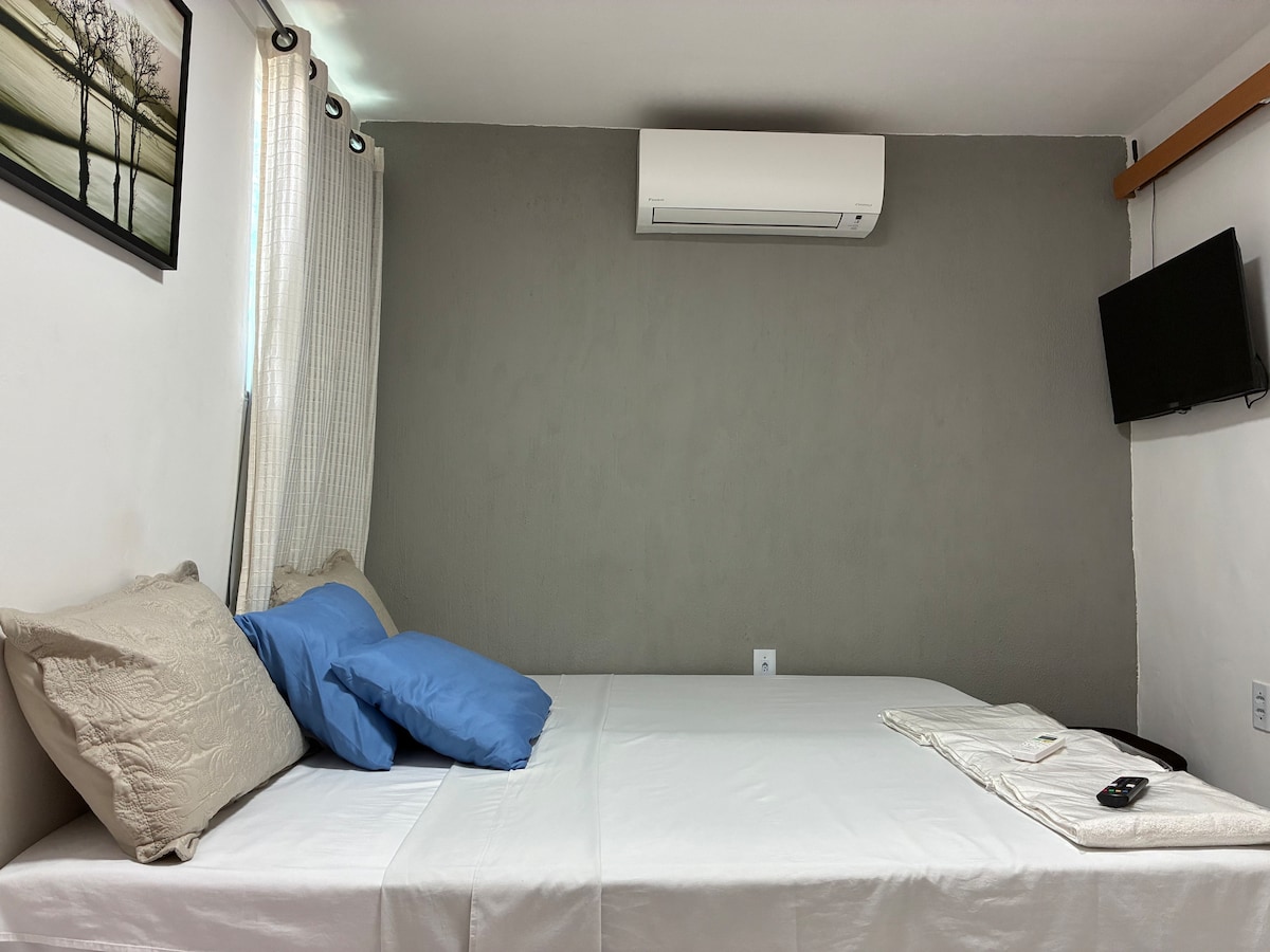 Espace 100 % privé Calme Machine à laver Climatisation À 10 min à pied de la plage de l'Artiste et d'Areia Preta 1 place de parking 2 lits simples convertibles en lit queen size + 1 lit supplémentaire Câble Ethernet Rj45 disponible Placard, fer à repasser, lisseur, sèche-cheveux, télévision cuisine complète, four, filtre à eau, cuisinière, réfrigérateur, mixeur bain chaud, shampoing, savon, après-shampoing hamac sur le balcon WiFi jeux de table pour les familles, les voyageurs, les étudiants.