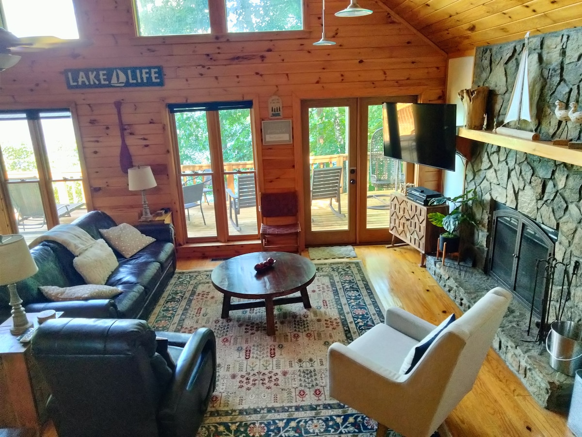 Vacances sur le lac Blue Ridge très propre et profond où nous avons une belle vue sur le lac de l'intérieur et de l'extérieur de la cabane. - Proche du lac avec de l'eau toute l'année - Grand quai à 2 amarres - Chaises longues sur le quai et la terrasse - Bain à remous ; - Gilets de sauvetage - Kayaks - Table à gaz - Salle de jeux avec ping-pong et air hockey - Chaises à bascule pour enfants et adultes - Un accès à internet à haut débit - Vue imprenable sur le coucher du soleil - La chambre longue est ouverte avec un écran de confidentialité