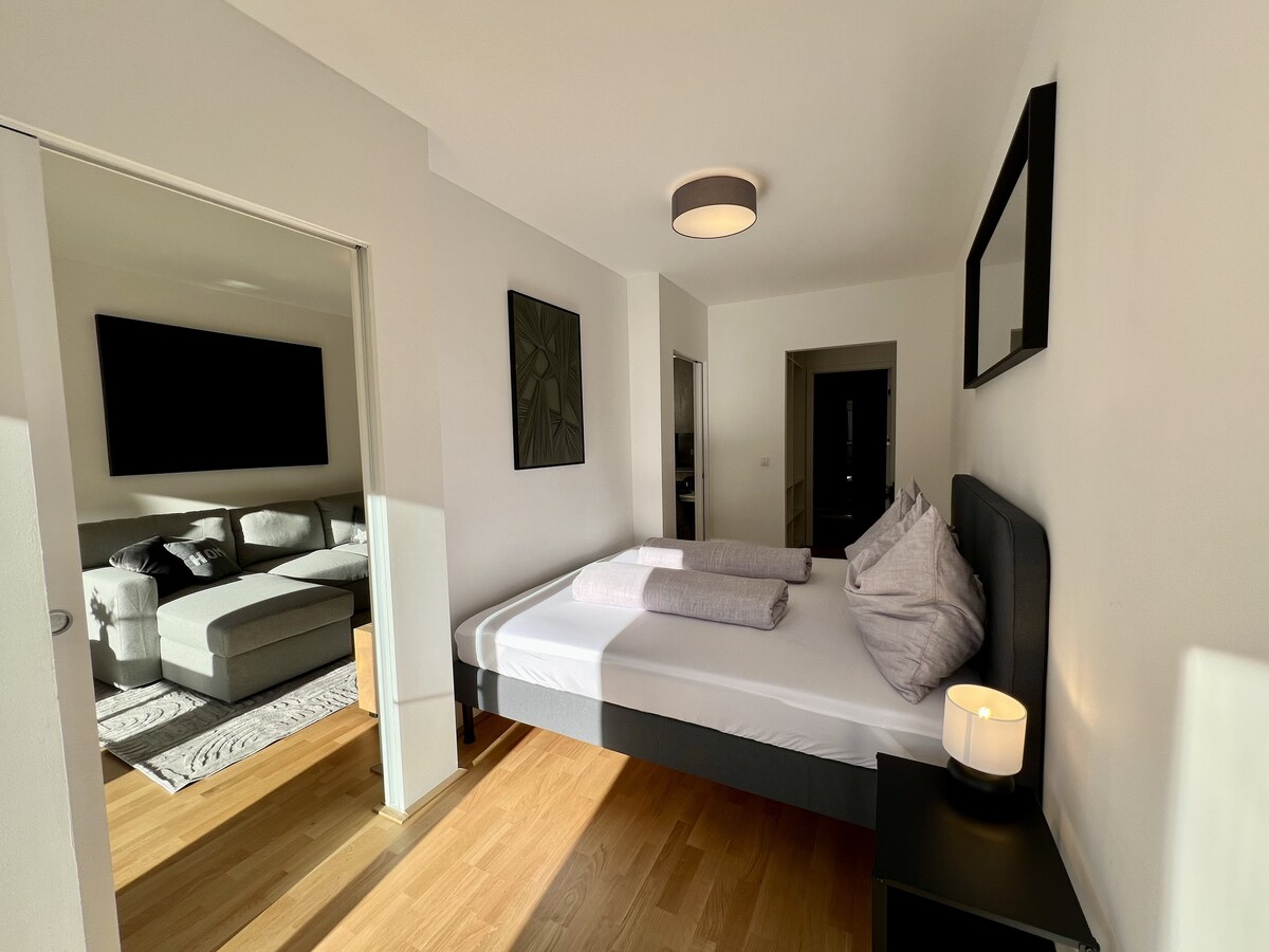 Un endroit pour se sentir bien – avec des détails charmants, un équipement confortable et une terrasse ensoleillée pour se détendre. Cet appartement lumineux de nouvelle construction allie design moderne et confort. Parquet raffiné, grandes fenêtres, chambre séparée, cuisine spacieuse et toilettes séparées. La terrasse avec vue sur la verdure invite à la détente. Situation calme, très bien desservi, en 30 min. dans le centre. Smart TV, wifi et ventilateur inclus. Parfait pour les escapades en ville, les voyages d'affaires, les nuits de concert et bien d'autres !
