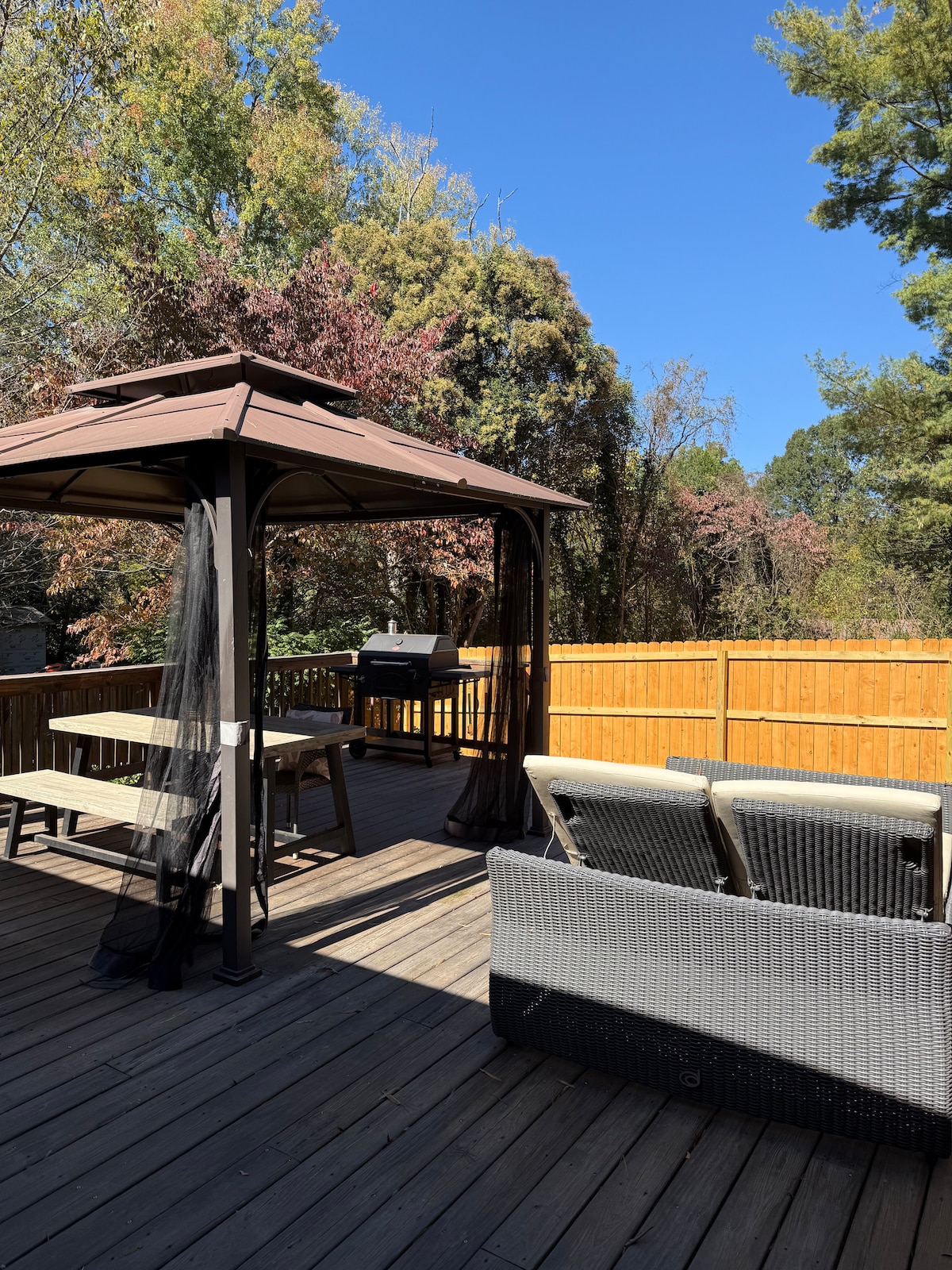 À quelques minutes de Wake Forest, nous avons entièrement rénové cet endroit très spécial. Nous nous sommes souvent tenus aux immenses fenêtres de cet espace au rez-de-chaussée et avons regardé des mères cerfs avec leurs faons jouer dans la cour. Votre maison loin de chez vous se trouve au bout d'un cul-de-sac déjà calme, donc le bruit de la circulation est nul. Votre suite est entièrement privée avec sa propre entrée au rez-de-chaussée. Votre cuisine dispose d'un évier de grande taille, d'une cuisinière à induction, d'un réfrigérateur, avec tous vos ustensiles de cuisine, vaisselle. Nouvelle salle de bain avec baignoire.