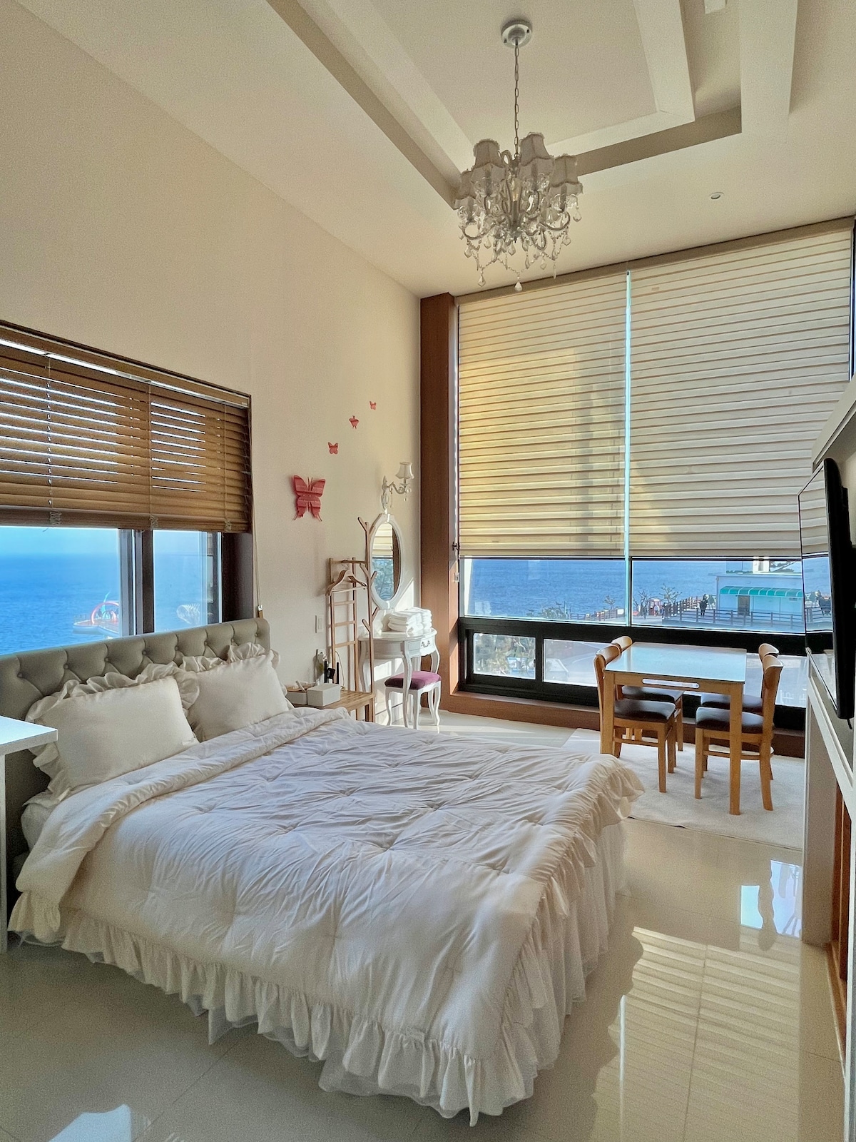 Bonjour ^^ Je suis Tru Stay, qui gère l'hébergement tout en vivant localement. Lorsque vous entrez par la porte, la mer magnifique vous accueillera par la fenêtre du salon. Veuillez passer une matinée tranquille avec un départ à 12 heures Type de chambre - 1,5 pièce (chambre + salon, cuisine + salle de bain) Vous pouvez profiter de la meilleure vue sur la mer au 10e étage avec vue sur la mer Le téléviseur du salon vous permet de profiter de vidéos OTT telles que Netflix et YouTube. Remplissez l'espace avec des haut-parleurs Bluetooth à votre goût Il est à 5 minutes en taxi de la gare KTX Mukho/Donghae et du terminal de bus interurbain. Il y a la plage de Hansum et le sentier de la plage à moins de 3 minutes à pied de l'hébergement. Il est facile de se rendre au centre-ville, où se trouvent des restaurants gastronomiques, des commerces de proximité 24 heures sur 24 au rez-de-chaussée du bâtiment, des épiceries, des magasins Daiso, des cinémas Lotte, etc. Vous pouvez utiliser les installations de l'immeuble, y compris l'observatoire sur le toit, le centre de remise en forme, les installations sportives et la buanderie à pièces. (certains payants) - Autres - 1. Nous vous enverrons un message d'information (mot de passe pour la serrure numérique de la porte d'entrée, numéro et informations) le jour de l'enregistrement. 2. Adresse de l'hébergement : 136-4 Handsome-ro, Donghae-si, Gangwon-do