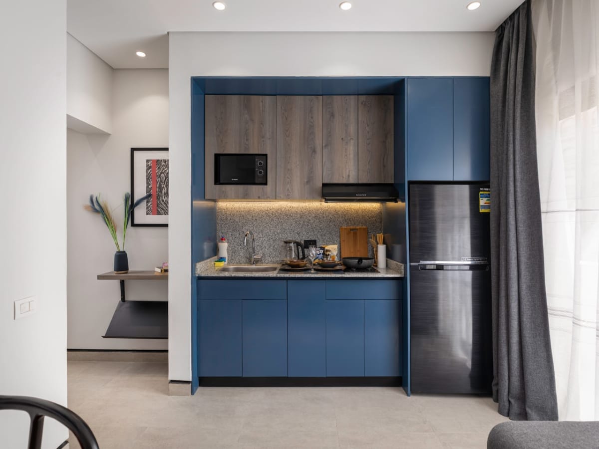 Une salle de sport privée et un tapis de course donnent le ton à cet appartement de 2 chambres bien situé au cœur du centre-ville du Caire. • Deux chambres avec salles de bain privatives • Cuisine entièrement équipée avec sièges de bar • Espace de vie confortable avec TV • Zone historique évoluant vers un centre touristique dynamique • 6e étage avec ascenseur, accès RFID, boîte à clé sécurisée • Portier 24h/24 et 7j/7 pour la sécurité et la facilité