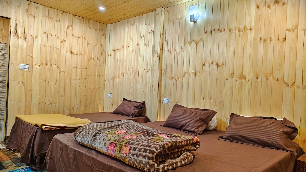 Une maison de montagne construite à la main à 2 400 m d'altitude, où la route se termine et où les fenêtres donnent sur l'Himalaya. Villa conçue par un architecte avec des murs en verre, des intérieurs en bois et des sommets enneigés depuis votre lit. Chaque poutre portée à la main ou par mule — construite à l'ancienne façon de la montagne. Atteint par une randonnée de 25 à 30 minutes en montée depuis le point de stationnement — un véritable sentier de montagne, pas une promenade plate. Planifiez en conséquence si vous voyagez avec des personnes âgées ou de jeunes enfants. Chevaux disponibles sur demande.