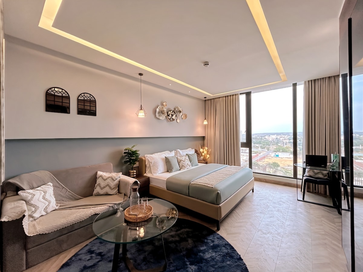 Détendez-vous dans cette escapade unique et tranquille. Réveillez-vous avec une vue rafraîchissante sur Aravali au Penthaus Studio 17, un espace lumineux et élégant conçu pour des matinées paisibles. Les tons doux, le décor épuré et la lumière chaude du soleil créent une ambiance calme et exaltante. Le studio dispose d'un salon confortable, d'un coin chambre confortable et d'une cuisine entièrement équipée. Les grandes fenêtres apportent de la lumière naturelle, tandis que les rideaux pleine longueur offrent de l'intimité en cas de besoin. Emplacement actuel : Citadines Paras Square, Sector 59, Gurugram