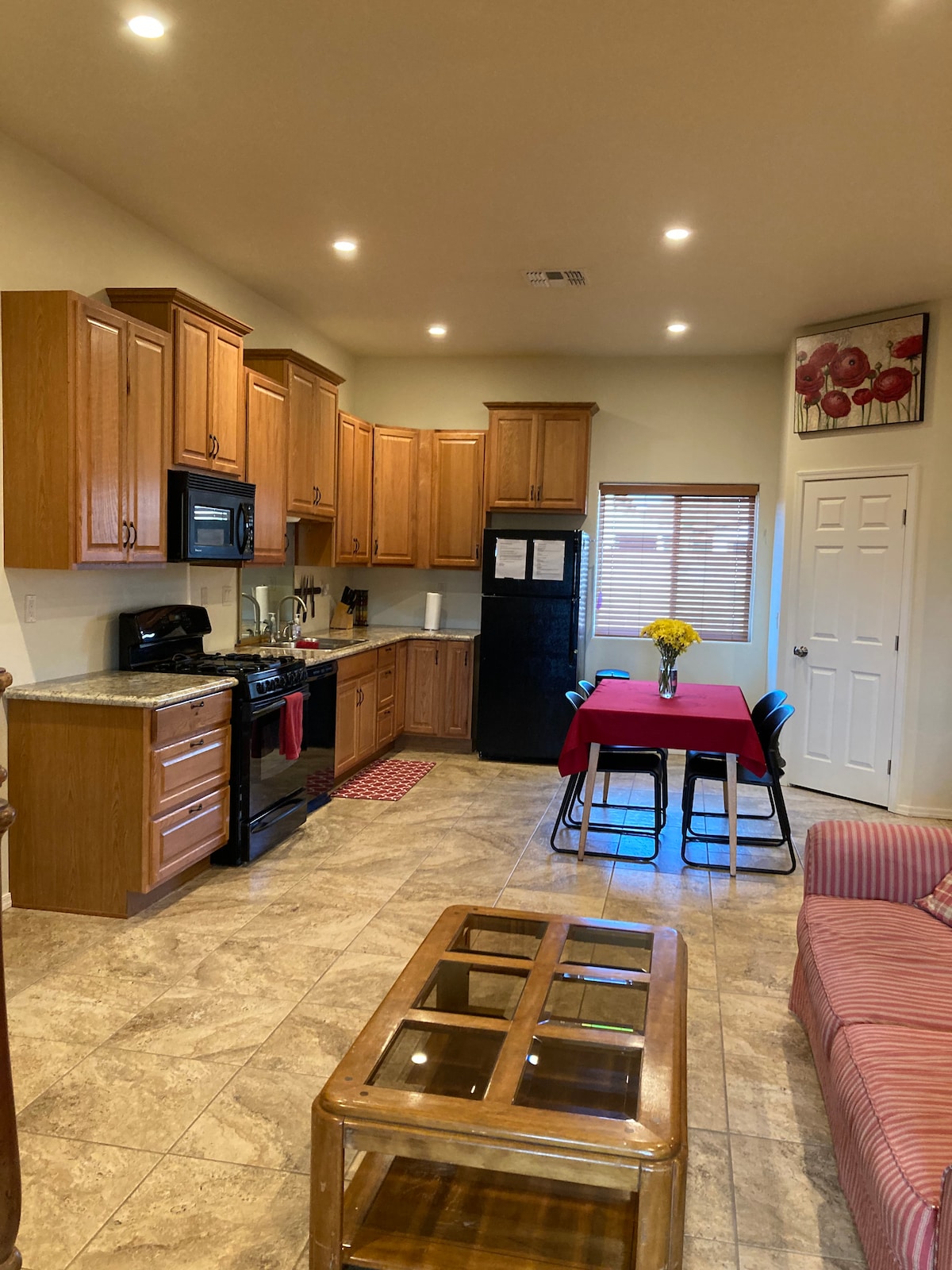 Un peu à l'écart, pas trop. Situé entre Phoenix et Tucson. Un studio confortable avec une ambiance bohème. Une cuisine entièrement équipée attend nos voyageurs. Un coin café gratuit pour cette première nécessité du matin. Un matelas en mousse à mémoire de forme Queen Size dans la chambre. Un futon pour les enfants. Un lit pliant pour les tout-petits ou les bébés. Désinfecté pour votre tranquillité d'esprit. Une escapade parfaite et pratique entourée par notre magnifique désert.